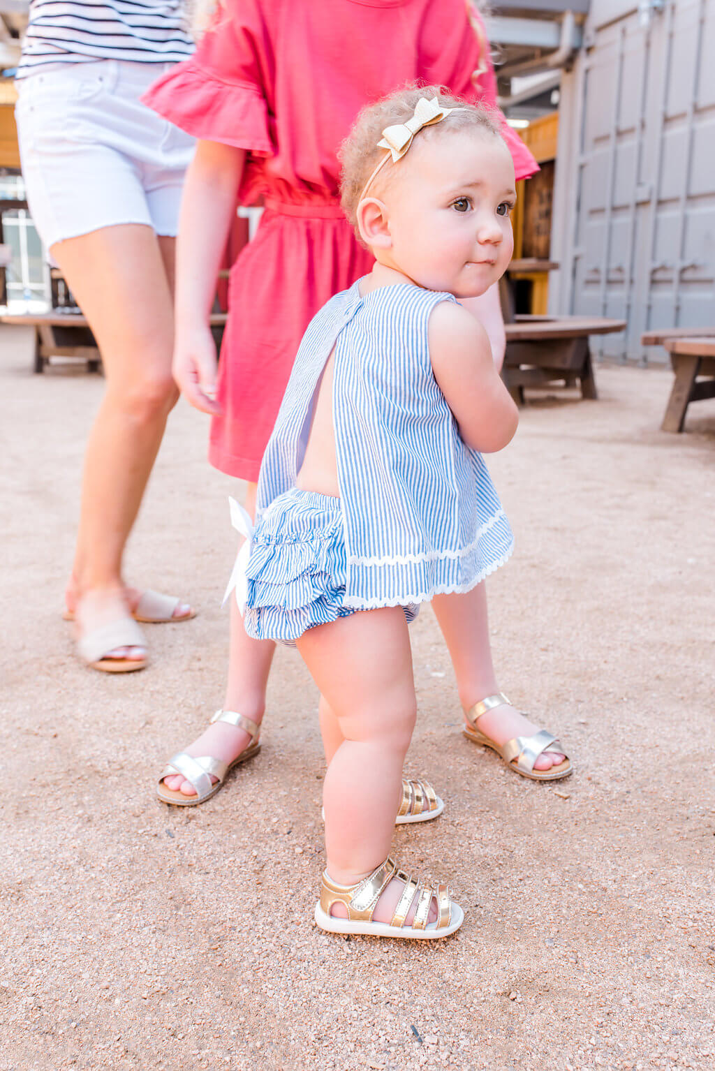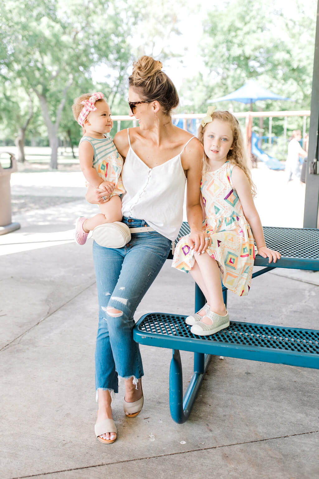 A Day in My Summer Routine | Summer Edition June 11, 2018 | Good MONDAY Morning, Friends! How was your weekend? Ours was VERY laid back and we soaked in every minute of the (EXTREMEly warm) sunshine. We are trying to get the gals (and ourselves) re-acclimated to the Texas heat and whew it’s HOT! Thankfully, they are enjoying the pool and it’s an easy way to wear them out daily 😉 There are so so many posts that I’ve been dying to write and quite frankly our Summer routine hasn’t really allowed for it, so I’m using today’s post and am cramming lots of fun content into just one blog. I’m going through a day in the life of a blogger (summer routine edition), what we eat, easy outfit inspiration, can’t live without Summer shoes and a few tips to keep you sane along the way. Here goes…tell me your schedule in the comments! -This post was written in partnership with Nordstrom and I always appreciate you supporting brands who make Style Your Senses possible. Kicking it off in the morning! I typically wake up between 5-5:30am depending on the day. Some days I will get in a morning sweat session and other days I use the quiet time to catch up on emails and get blog stuff scheduled for the day. The girls usually wake up between 6:30 -7 am and have a few minutes of playtime in the playroom while I finish my coffee up there with them. My Pajamas (See also the Short Set HERE) | Landry’s Pajamas | Lawson’s Pajamas (similar) If you have not tried THIS BRAND OF PAJAMAS yet I promise that you are missing out. I own 4 pair (long and short sets) and honestly they are the best I have. They are lightweight, breathable, cute and unreal comfy. Trust me and treat yourself to a pair. I always size up to a M in them because I like some room in jammies. Around 7 (detailed below) I bring them into the kitchen and get breakfast started… For breakfast the girls have one of the following: Gluten Free Waffles (Trader Joes) + Fruit Silver Dollar Pancakes (Trader Joes) + Fruit Oatmeal + Pecans + Fruit Puffins Cereal + Fruit On Fridays we have a tradition of making either chocolate chip pancakes or chocolate chip waffles and we all look forward to it! I use the Kodiak Cakes mix and we LOVE it. For Breakfast I Eat: This Coffee + Chocolate + Banana Smoothie is my FAV Summer breakfast Two Eggs Over Easy + Avocado “noatmeal” (1 mashed banana + 2 eggs + dash of cinnamon). Scramble, pan fry in ghee stirring constantly. Top with chopped apples, cashew butter and nuts. Puffins Cereal with walnuts + almond milk + fruit Magnetic Dolls Dress Up Set (Landry loves playing with these!) Side note: you guys know that I work on the blog full time, but I like to have a more flexible Summer routine so that I’m able to spend as much time with the girls as possible. During the week, the girls have a darling sitter who’s with them MWF from 8-1. I try to get as much work done as possible during that time and then can usually squeeze a few more hours in during afternoon naps. It’s not a schedule that’s maintainable long term, but during the Summer it absolutely works. To keep things consistent and structured for the gals, I copied my sister’s genius idea and came up with this clock that breaks down how their days will look. Landry likes to know what’s coming up, so this gives her a breakdown of the day and also helps her to tell time. It makes it easier for the sitter too because if it’s not on the clock, it makes it much easier for her to say no to consistent snack requests, etc. Here’s a Summer Routine Breakdown: 7-8am | Wake up, change diaper, fix breakfasts 8-9am | Get ready. While mommy gets ready Landry can have 30 minutes of screen time so long as her bed is made. 9-12 | Daily Activity. I try to make these super fun, especially during the Summer. Our go-to’s are the park, the library, the kids museum and the splash pad, but I also have a jar filled with paper slips of EXTRA fun activities and once a week will let Landry pick one out so we are all surprised. A few examples are “get a snow cone,” “visit Daddy at work,” “ride the train” and “waterpark.” I love the element of surprise just as much as they do! 12 pm | Lunch 1-4 pm | Naps + Quiet Time. Lawson will nap for a solid 3 hours most days and Landry is usually around 1.5-2 hours. When Landry wakes she can play in the playroom or get out her “boredom box” and sit with me at the table while I wrap up work. Her “boredom box” is filled with crayons, markers, kinder prep books, scissors, puzzles and coloring books. It really does keep her busy for a while. Some days when I can tell she’s over it, I will allow her to watch a movie. 4-5:30 pm | Afternoon Activity. These I can’t always guarantee to be fun, but they get us out of the house. Likely it’s running to the grocery, short errands, or taking a dip in the pool. 5:30 – 7 pm | Dinner + Baths 7:30 | Lights out for Lawson / 8:00 Lights out for Landry. My Summer Routine Outfit: Button Up Cami | AMAZING Crop Jeans | Slides | Similar Belt Bag | $14 Sunnies | Earrings Lawson: Bubble | Headband | Shoes Landry: Dress | Shoes I haven’t really talked about how much we love our new area (I promise I’ll share more in an upcoming post), but we LOVE our new area! There are 3 amazing parks within one mile of our house and the girls love to choose which one they want to play at that day. Here’s one of our favorites and what we would wear for a fun park day. I swear every mom needs two things to be a part of their #momiform this Summer…one is a great cami and the other is a belt bag (aka fanny pack). Both are super functional mom life and both keep you feeling cute while still running after the kids. Mama’s I know that the thought of owning a fanny pack may not strike you as glam, but I’m promising you that they are super chic and unreal functional. Wearing my “belt bag” I can be completely hands free with the girls and still have my keys, cards and phone with 