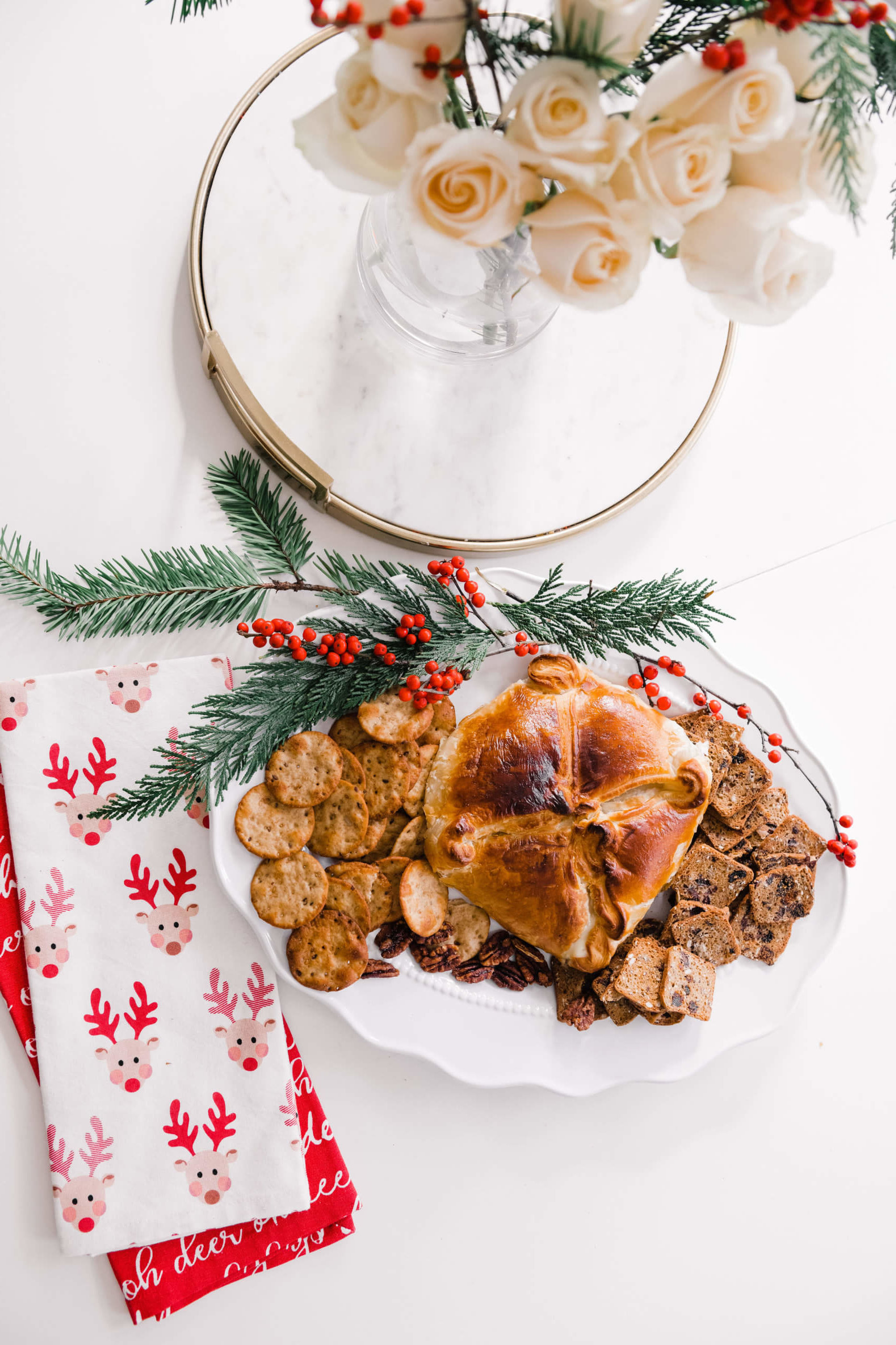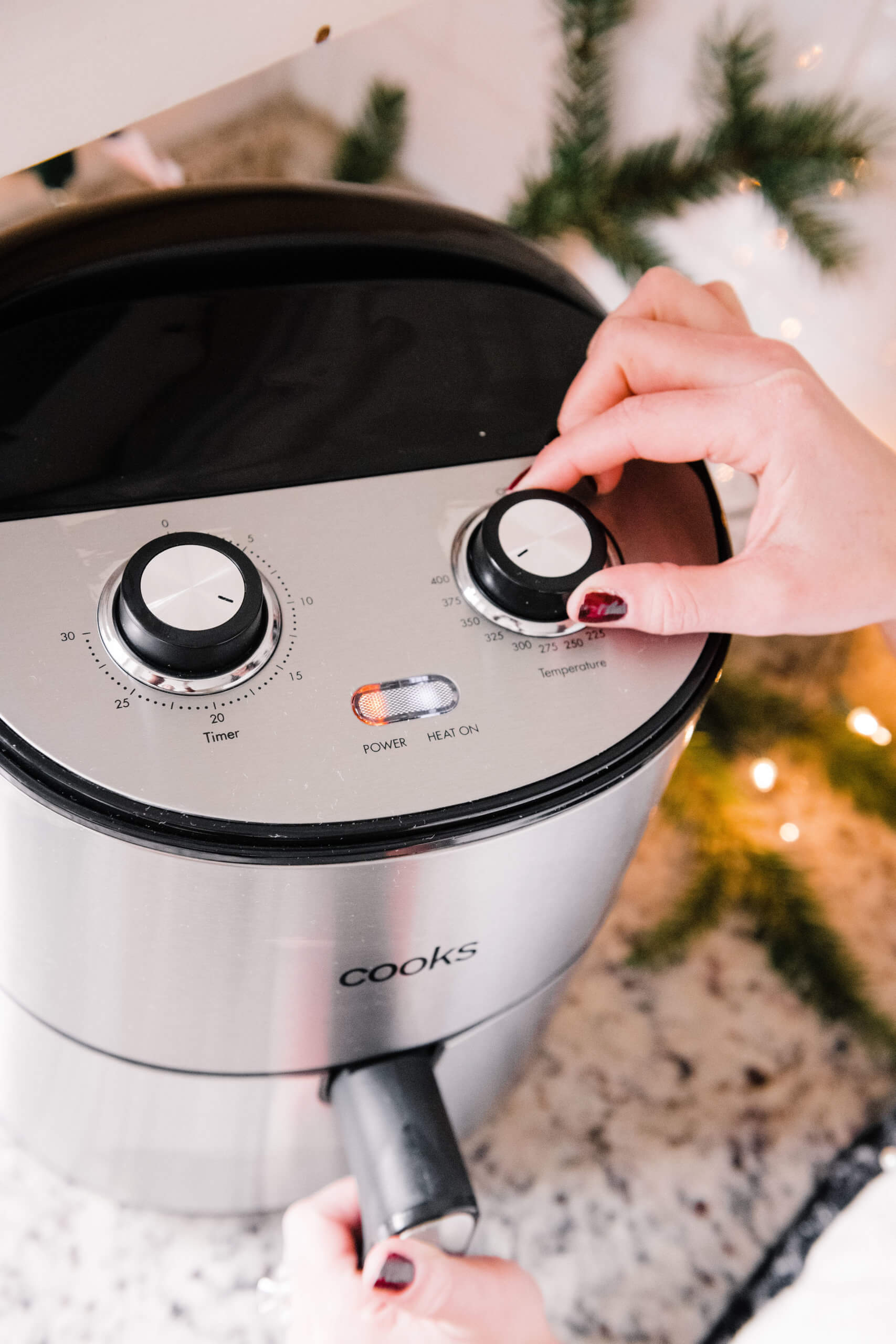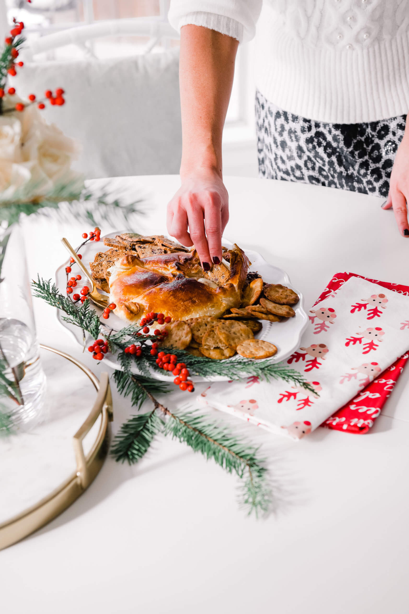 Hostess With the Mostess With JCPenney + Air Fryer Brie Recipe December 15, 2019 | *This post is sponsored by JCPenney and ShopStyle. Today I’m partnering with JCPenney and I’m giving you an easy and inexpensive formula to be Hostess with the Mostess this Holiday season! I finally caved and bought an air fryer and am making the most delicious air fryer brie recipe for you guys to entertain with over the next few weeks! I’m also showing you the cutest outfit all from JCPenney so that you can look darling, stay on budget and allocate more budget to entertaining friends and family! Hostess With the Mostess With JCPenney: Air Fryer | Ivory Sweater with Pearl Detail | Sequin Leopard Skirt | Black Heels First, let’s talk outfit! The entire thing (sweater and skirt!) are around $45 and it looks like a million bucks! The sweater is a plush, soft cable knit, with chic balloon sleeves and delicate pearl embellishments. It’s a great TTS fit (I’m wearing a S) and is priced under $30, which is a STEAL for this quality you guys! The skirt is leopard print with a full layer of clean sequins sewn on top. It gives just the right amount of shimmer and shine to make it feel special, without being over the top. It’s a pull on elastic waist and is super easy to wear. I’m wearing a small here but would recommend sizing down for the best fit! I paired the set with a simple, classic black pump and felt comfortable enough to entertain in, but festive enough for the Holidays! Now let’s get to this recipe goodness!!! Y’all I was hesitant to buy an air fryer! The counter space it takes up, having another big contraption and also learning how to use something else was all together intimidating. BUT I’ve really never heard a bad review about having one, so I have to admit I was intrigued. Not only does it offer a healthy alternative to deep frying food, but it makes achieving the fried taste and texture easy and mess free. I pulled the trigger on this COOKS air fryer at JCPenney on Black Friday for a steal of a deal and am SO glad that I got one. The first recipe that I tried in it was this brie wheel and it totally knocked my socks off. If anyone on your list loves to cook or may be interested in an air fryer, THIS one is such a great option. It’s large enough to cook for a family but can also be stored in the pantry or a cabinet when needed. Here’s the super easy, no fail recipe that’s absolutely perfect for Holiday entertaining! Air Fryer Brie You’ll need: -Brie Wheel (without rind) -Fruit preserves (I chose raspberry) -Sprinkle of brown sugar -Roasted, chopped pecans -Puff Pastry (thawed) Directions: Pre-heat air fryer to 380′ Place puff pastry on a greased sheet of foil that will fit into the fryer tray Roll out puff pastry, place brie at center Layer on a generous amount of fruit preserves Top with chopped pecans Sprinkle with brown sugar I cut a round piece of puff pastry to place on top of the brie so that all areas were enclosed and nothing melted out. Fold the brie up in the puff pastry, pinching closed at seams. Brush lightly with an egg or melted butter wash Place in air fryer for 15 minutes at 380′ OH MY GOSH IT CAME OUT SO GOOD! Ta-dah! In under 15 minutes I now have this beautiful appetizer that’s certain to be a crowd pleaser! I served it with a variety of sweet and salty crackers and garnished it with seasonal berries and stems. I am so impressed with the power of this air fryer for the price and cannot wait to try so many more recipes! If you’ve been contemplating an air fryer, this one from JCPenney is certainly worth adding to your list. The recipe options are endless and easy! If you already own an air fryer, you certainly can’t go wrong with this outfit for the price, so really it’s a win win situation! Other fun kitchen gifts to give:
