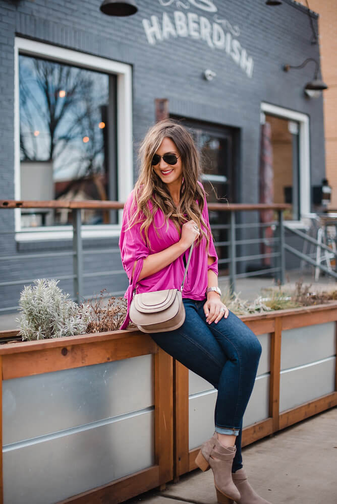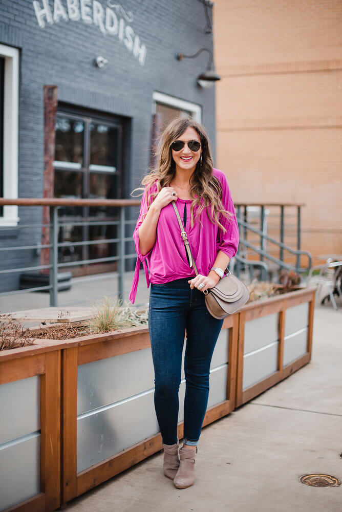 Casual Free People Top March 10, 2018 | Popping in to share the cutest, casual Free People Top with you guys for Spring because it’s ON SALE! Another great piece that’s buy now, wear now and will take you through the Summer with denim shorts. Crazy enough, it’s regular $68 and is on temporary price match for $33! That’s half off…which is crazy for Free People in general! I always gravitate towards this magenta color, but this top all comes in beautiful prints, too (although they aren’t on sale). Anyway, here’s how I styled it for a weekday casual outfit running around with the kids or even on the weekends for a day of errands. Turn on your JavaScript to view content Top | Jeans | Booties | Crossbody (under $50) | Sunnies | Watch | Earrings These are also the same 10′ rise jeans that I raved about in the Denim Review! To me, they fit an actual woman’s body so well and the high rise in this dark wash is really slimming and elongating. I now have two pair of jeans from this brands because I love the fit so much. Shop all Madewell HERE Shop all Free People HERE …p.s. I should also mention that this top is completely nursing friendly as the buttons are functional. I also love that the twist front gives the illusion that it’s front tucked but you don’t have to deal with actually tucking it in. For all of my Charlotte, peeps…have you been to Haberdish? Definitely one of my fav CLT eats! Their specialty is fried and baked chicken and both are out of this world. They also serve hush puppies with sweet tea butter and it’s out.of.this.world. Their cocktails are also unbelievable! I hope that you guys have a great weekend. We’ve been in Dallas for right at a week now and are starting to settle in, but actually really miss Charlotte. Today we are going to shop for a new fridge and new sofa. Tune in on Instastories today for more! Turn on your JavaScript to view content Other posts that you might like: Denim Review for Real Women White Peplum Top + Jeans One Sweater / Worn 3 Ways
