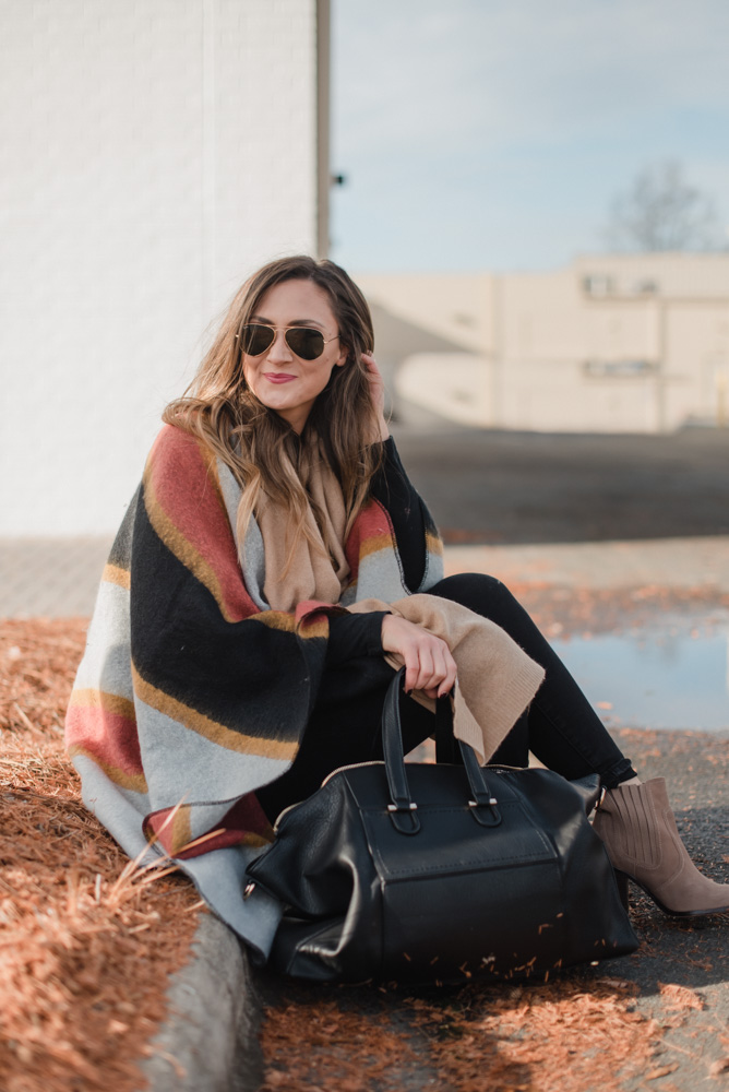 Cozy Holiday Travel Outfit Ideas + Our Holiday Travel Plans + Tips December 14, 2017 | Good Morning! Writing to you with the strongest possible cup of coffee that I could make at 5:00 a.m.! Sweet Lawson is teething something fierce so we are just getting by over here. Hopefully she get some relief soon because we soon leave to head home for the Holidays, which brings me back to this post…cozy Holiday Travel Outfit Ideas and our crazy Holiday travel ideas. I’ve said it before, but Sole Society is becoming one of my absolute go-to retailers for all things shoes, apparel and accessories and I’m excited to show you what I found there today for cozy travel outfits that won’t break the bank! *Note that everything in this post is available to make it to you in time for Christmas, just select 3 Day Shipping at checkout!* Turn on your JavaScript to view content Color Block Poncho (ON MAJOR SALE!) | Weekender Bag (Under $70!) | Cashmere Travel Wrap (on SALE!) | Cashmere Beanie (not shown) | Booties (that I wear nearly everyday) First, before we talk about how cute it is, can we talk about why all of the sudden this style is now called a “ruana” now instead of just a plain old “poncho” or “cape”?? If you’ve been searching for them and are coming up with no results, this is probably why. Anyhow, I digress! Obviously, I’m having a thing with rust colors and deep orange hues this season (SO out of the box for me) and this poncho caught my eye RIGHT away. I could see it fitting in to my current wardrobe seamlessly and pairing back to all of my neutrals perfectly. It’s actually a bit thicker than most of my ponchos and actually really adds some warmth to the top layer, making it fine to wear a long sleeve t-shirt or turtleneck underneath. Turn on your JavaScript to view content Here’s why I love wearing a poncho when traveling in the Winter: -Easy to shed in the airport, specifically security. You can be warm and cozy getting to the airport, but don’t have to worry about shedding lots of layered sweaters upon entering the airport or back up the security line. This thing is on and off in a few seconds and easy to throw on and go -They serve as a blanket on the airplane.I love wrapping up in a good poncho and appreciate the extra fabric to snuggle in. -They are baby carrier friendly! Call me vain, but can we talk about how unflattering baby carriers can make the backside look? I mean good gracious so many lumps from that dang thing! If I’m wearing Lawson in a carrier (which I do 90% of the time through the airport), I always have a poncho thrown over me. That way it’s hiding all of the situation from the carrier and also serves as a blanket to wrap around her. Win WIN! -Not related to traveling, but they also make amazing gifts. Women of all ages can wear them and they are one size fits all so they make a good universal gift! See all ponchos HERE. Turn on your JavaScript to view content So many favorites in this post, but the best value definitely lies within this weekender bag! Would you believe that it’s under $70??? I didn’t either until I actually got it in my hands! It’s vegan leather and has the cutest black and white spotted interior and is amazing quality for this price. It also comes with a long cross body strap, which is especially amazing for traveling with kids, because let’s be clear—you’ve got to have both hands free in the airport to manage them. I’m bringing this one on-flight for our trip over the weekend. I’m going to use it as Lawson’s diaper bag, plus Landry’s essentials bag. I’ve found that my regular diaper bag is just too dang small to take on a plane, given everything that needs to be in it…so this will be the perfect solution that will still slide under the seat should I need it to. I put an assortment of Sole Society’s Weekender Bags at the top of this paragraph to show you that they are kind of “known” to make adorable weekenders for .a super affordable price. I love the cognac color, too! A cute gift idea would be putting a poncho and a cute beanie hat within one of these weekender bags as an amazing gift for the gal who travels! See all under $100 Weekender Bags HERE. As a special Holiday collection, Sole Society also launched a few cashmere pieces and let me tell you they are delicious! I got the travel wrap (above) and the matching beanie (that you’ve seen me wear on Instagram before). The wrap is much more full than a traditional scarf, so you could actually use it for more of a blanket + wrap on an airplane or during a long road trip. If you have a cashmere lover on your list, this is such a good thing to snag. Turn on your JavaScript to view content Y’all know that I wear these booties nearly every dang day. They easily slip on and off, give me a little height without being too tall and are comfortable enough to wear all day with the girls. As if the Holiday’s aren’t already crazy enough, we always decide to be extra special and make the trek to Grandma’s house and back every year, kids in tow. Since our families live in different states it’s really hard to figure out a anything really fair, so instead we’ve found a way to hit both of them in one trip. This weekend we will all fly out of Charlotte and to Dallas (where Dan’s family lives). We get to visit and celebrate Christmas with them next week and also get to catch up with old friends while there. Mid-week we will then rent a car and drive over to my family in Louisiana. Normally we drive straight through (only about 6 hours), but this time with Lawson, we are making a pit stop to stay the night in Houston (the halfway point between my family and his). On Friday, we then head to Louisiana to celebrate Christmas with my family. The following week, we will all head home and fly out of Baton Rouge back to Charlotte. The logistics of the trip are absolutely terrible to plan and orchestrate and I have to buy and ship every single gift to either