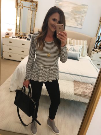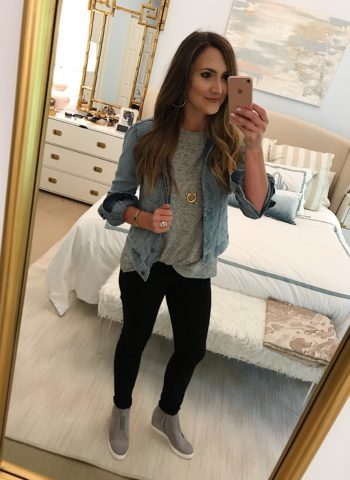 Fall Capsule Wardrobe for Busy Moms! August 17, 2017 | Ok ok I’m SO excited about this post!!! Like I haven’t been this jazzed in a long time! In my heart I know that no one sets out to look like crap on the daily. Everyone WANTS to look pulled together and feel confident, but unfortunately this season of life (aka Motherhood) doesn’t always allow us the time for that. Since nothing makes me happier than seeing mamas find their confidence again, I wanted to take a lot of the thought out of putting together a great outfit on busy mornings, so I’ve created a Fall Capsule Wardrobe for busy moms! I combed through hundreds of pieces, ordered a ton of stuff to try for myself, read nearly every review, and, in the end, I kept the best of the best (all at the best prices, I might add) and am showing you how to maximize each piece. There are only 25 items in this capsule (including shoes and accessories) and I’ve created tons of “everyday chic” outfits with them to serve as a resource for you busy ladies who don’t have time to think about crafting an outfit every morning! If you’ve been here a while, you might remember that I wrote THIS POST last year and it was a HUGE hit, but I was always a little bummed that it wasn’t very visual, as that’s the way I personally like to see things. This go round, I set out to really create a visual resource for you guys to use in your day to day lives. I styled tons of looks both in flat lays and on myself so that you get a feel for the fit and flow of the pieces. I wanted you to feel confident in that if you invested in the pieces of this fall capsule wardrobe that you will truly get your wear out of them. If you really wanted to make things easy and always have some inspiration on hand you could print this post out and keep it in your closet to refer back to the images when you need a quick outfit or even save it to your Pinterest boards to refer back to! Fit info: I’m 5’9 | 150 | Size 6 / 28/ M So, here we go…1 Fall Capsule Wardrobe… 25 pieces…all affordable, all functional, all highly rated, all versatile and all COMFORTABLE… THE ULTIMATE FALL CAPSULE WARDROBE JavaScript is currently disabled in this browser. Reactivate it to view this content. One / Black Tank $68 | Two / Grey Tee $25 (Another great grey v-neck tee option HERE) | Three / Stripe Tee $29 I chose 3 tees all with a different sleeve length and detail to give you some variety in your basics. all are super soft, comfortable and great as a Fall base layer. Four / Ivory Tunic $28 | Five / Black V-Neck Sweater $39 | Six / Stripe Peplum Top $35 | Seven / Tunic $49 ((Not shown // Grey Knot Front Sweater $49)) For a step up from a tee shirt, I chose quite a few different styles that are all quite functional. Each has a fun, unique detail to make it feel a little more “elevated” and they are all still great for layering. Oh and not ONE is over $50 bucks…huge win! Eight / Long Cardigan $49 | Nine / Denim Jacket $79 (Another great denim jacket HERE) | Ten / Camo Jacket $89 These Fall top layers each have great details but all work as very functional and versatile top layers as well. Eleven / Boyfriend Jeans $55| Twelve / High Waisted Jeans $69 (Another great high waisted pair of jeans HERE) | Thirteen / Dark Wash Skinny Jeans $59 (My other favorite pair of dark wash skinnies HERE) | Fourteen / Black Skinny Jeans $69 | Fifteen / High Waisted Leggings $54 I own and love each and every one of these pants and highly recommend each! Each one brings a unique fit and on-trend style without being excessive! Sixteen / (Similar) Olive Green Bag $295 | Seventeen / Black Bag $79 I chose one fashion color and one basic black bag but I feel like both are neutral! Both are functional for moms with a cross body strap option and both are big enough to carry kids’ junk without being too big. Eighteen / Long Necklace $48 (Gold Necklace Alternative HERE) | Nineteen / Gold Hoops $60 | Twenty / Gold Watch $250 I could honestly ONLY wear these three pieces daily and be totally content. They go with ANY and EVERY thing and are timeless pieces that you won’t get sick of! Twenty One / Sneakers $120| Twenty Two / Booties $89 | Twenty Three / Mules $90 | Twenty Four / Wedge Sneakers $120 All of these shoes are new for me this Fall and I am truly excited about each pair, but I have to tell you there are two specifically that I’m LOVING. The mules and the wedge sneakers are going to be my go-to shoes for Fall and let me tell you why… They are both beyond comfortable and each is so on-trend in it’s own right. I’m already loving styling them! Here are a few ways to wear the cute little knot front sweater. Note that it’s under $50 and comes in a ton of colors. It’s so soft that you will be reaching for it daily! Boyfriend Jeans | Mules | Grey Knot Front Sweater | Long Necklace (Gold Necklace Alternative HERE) | Gold Hoops $60 | Gold Watch Here it’s thin enough to layer the denim jacket over and looks so cute with slimming black jeans. Grey Knot Front Sweater | Camo Jacket Black Skinny Jeans | Mules | Gold Hoops | Gold Watch One of my favorite (and a little unexpected) ways to wear the knot front sweater was with this cute little peplum top underneath (right photo). It adds just enough interest and the peplum ruffle peeking out is just too cute. I buy this pocket tee EVERY.single.year. It’s the perfect lightweight layering piece for Fall and I love the slight boyfriend fit (along with the price)! I would wear it with nearly any outfit, but here it is with a basic skinny jean and slip on booties. Stripe Tee | Dark Wash Skinny Jeans (My other favorite pair of dark wash skinnies HERE) | Booties | Black Bag Long Necklace $48 (Gold Necklace Alternative HERE) Denim Jacket (Another great denim jacket HERE) | Stripe Tee | Black V-Neck Sweater | Black Skinny Jeans | Wedge Sneakers One of my new favorite tops (I actually wore it yesterday in the August heat because I love it so much) is th