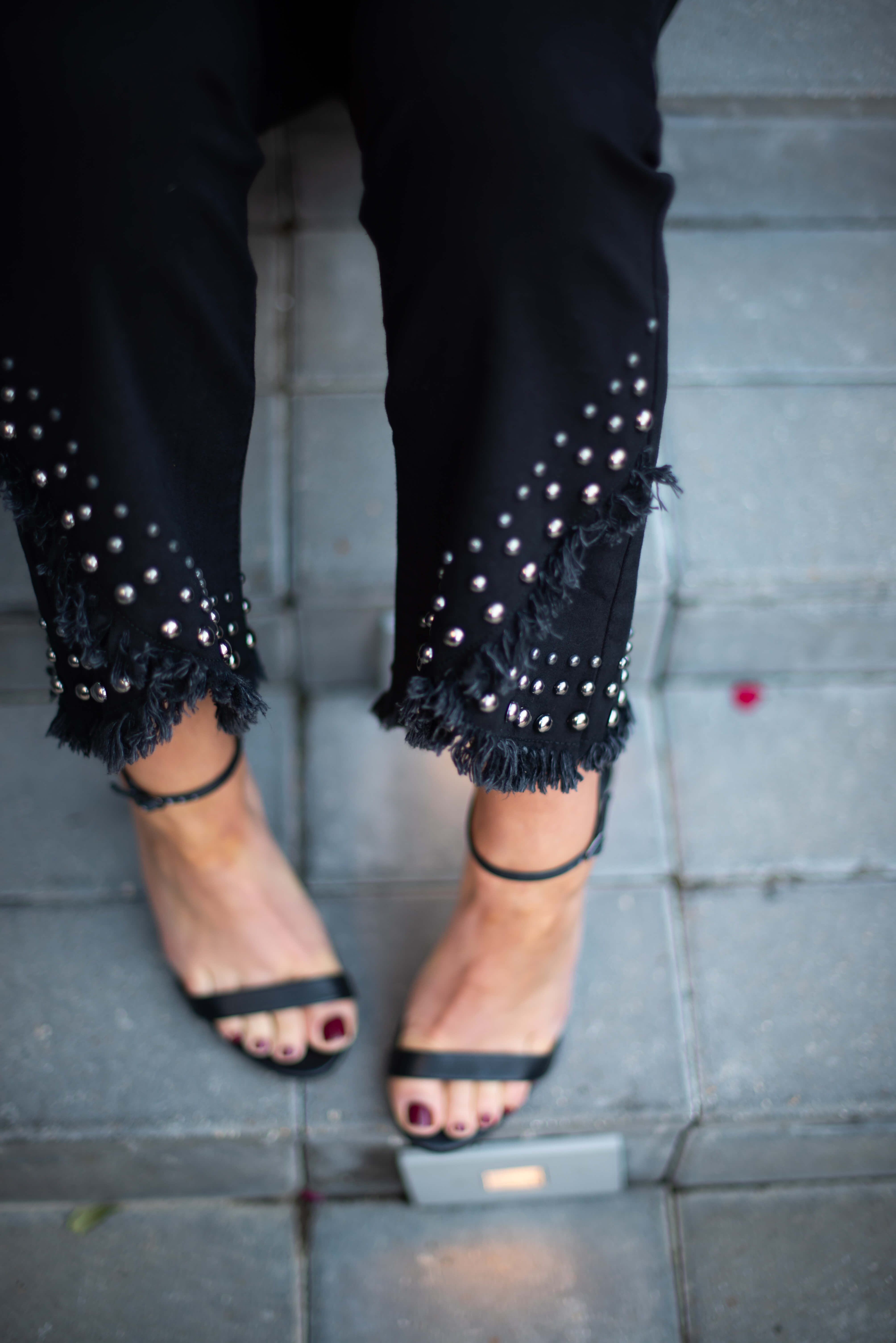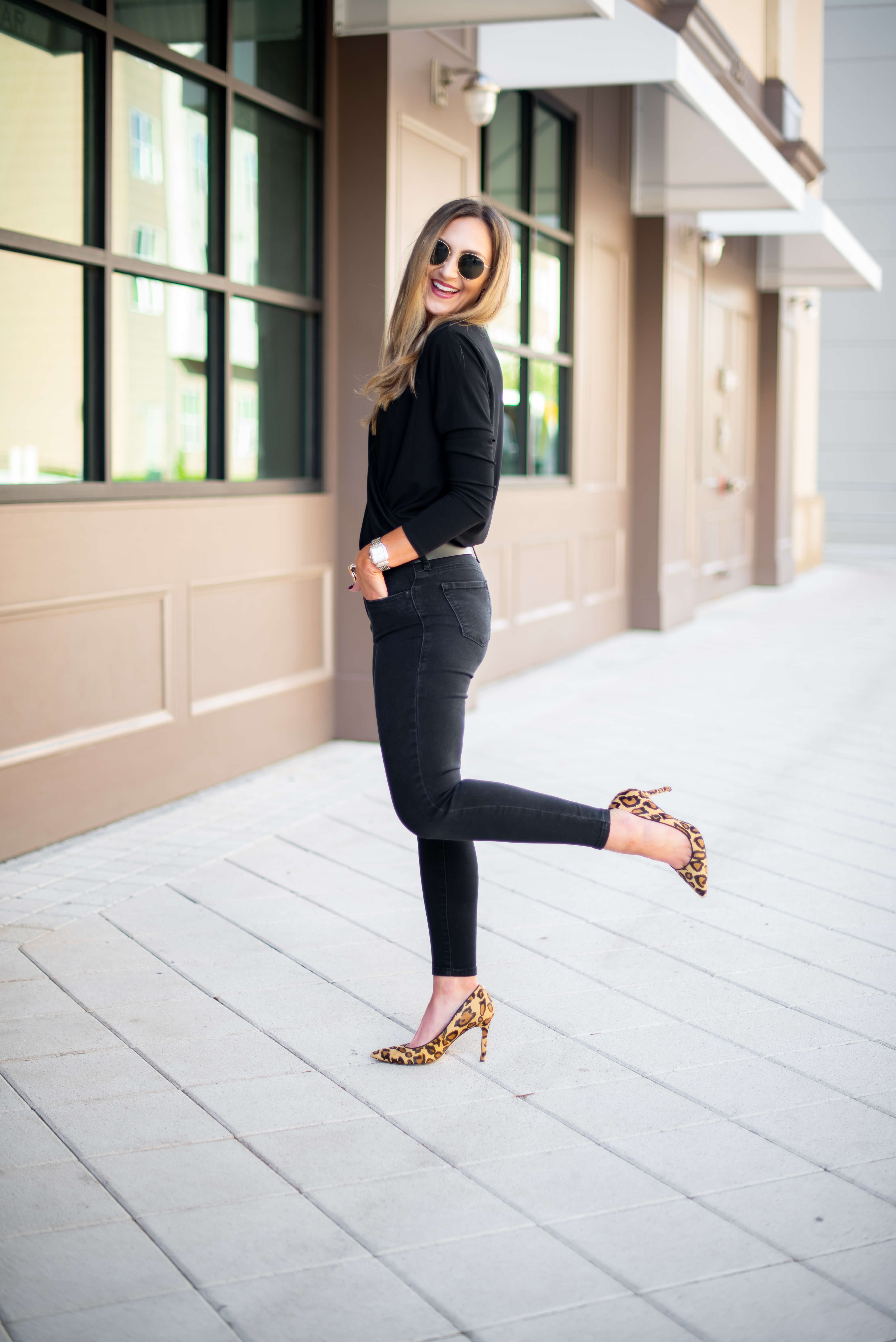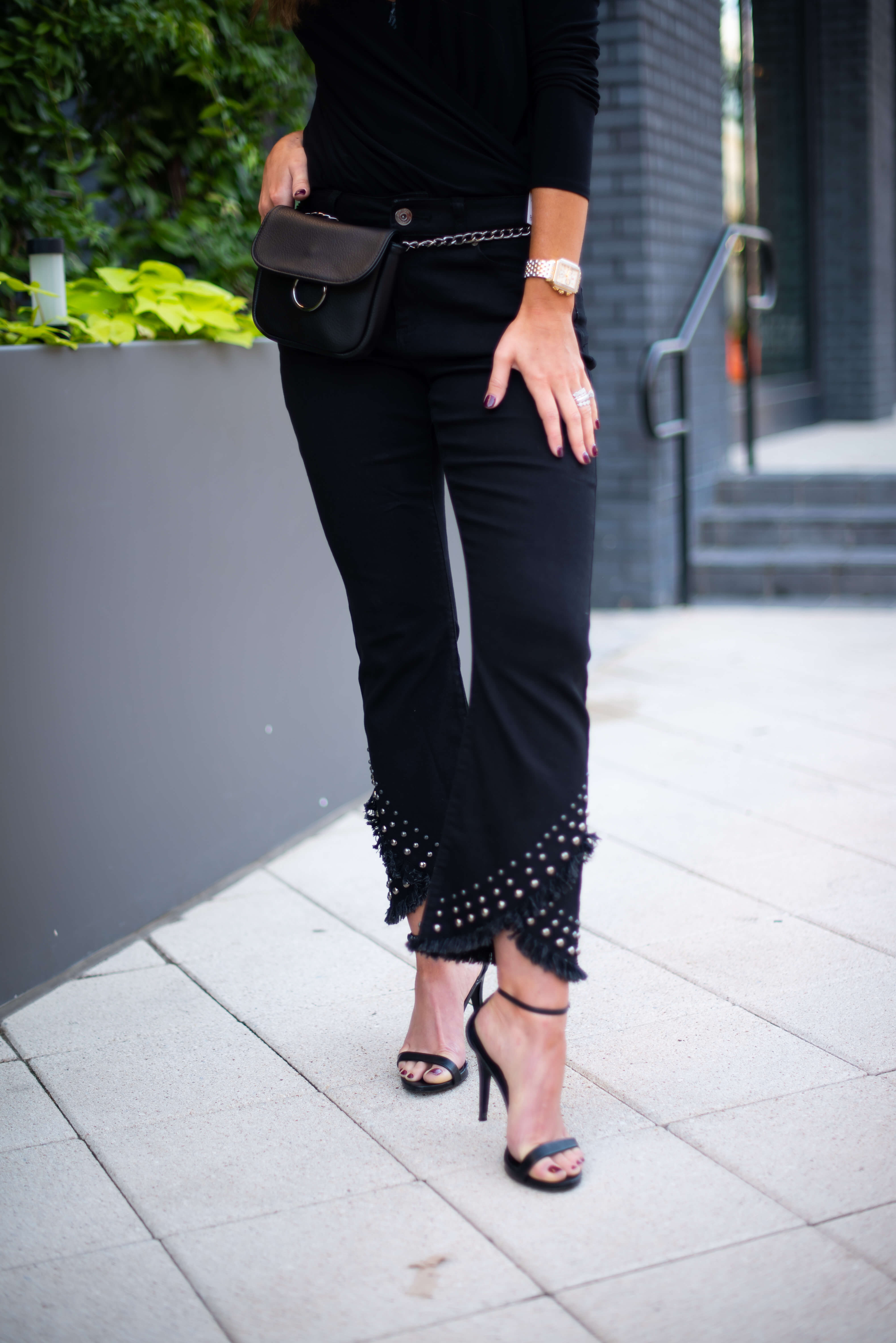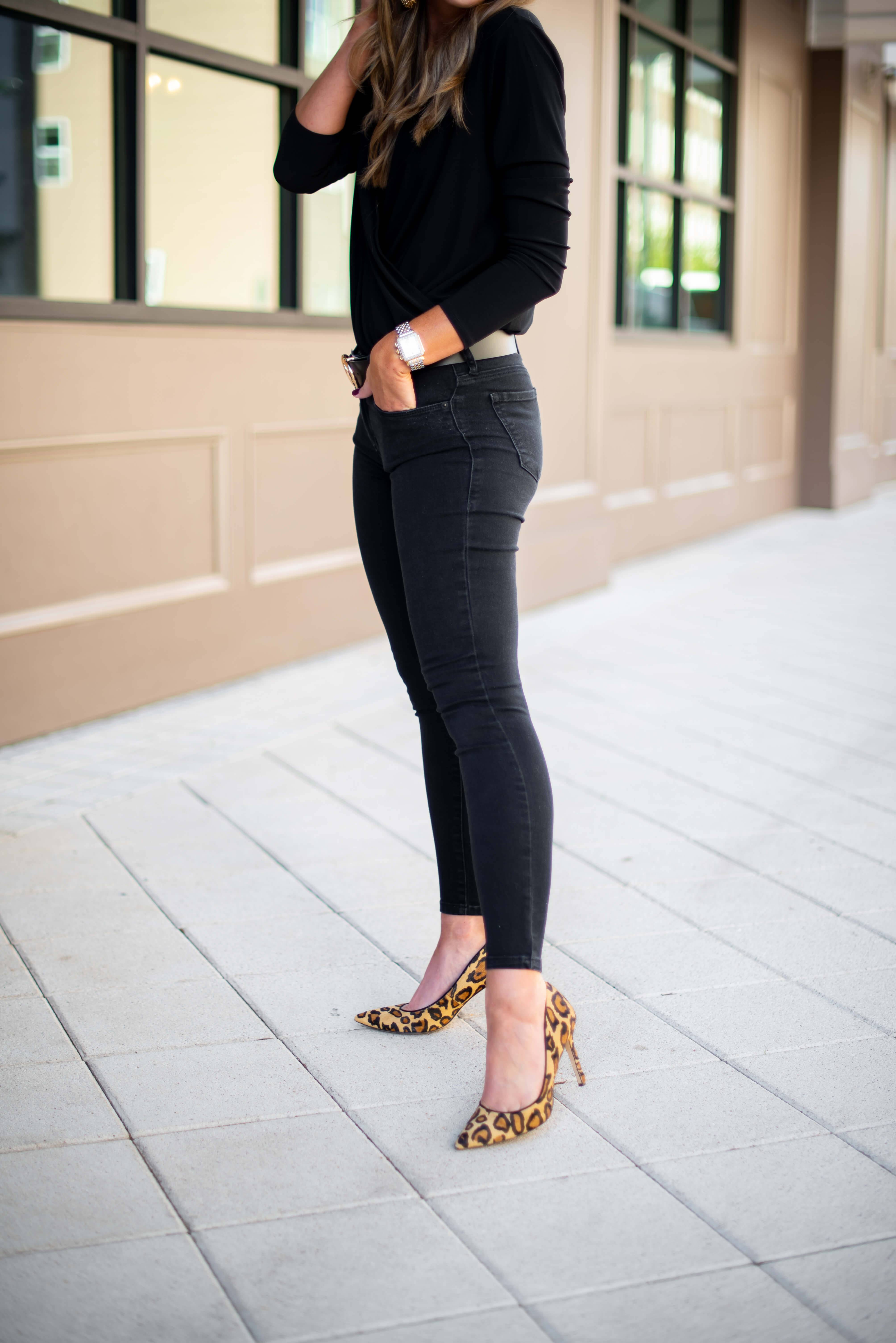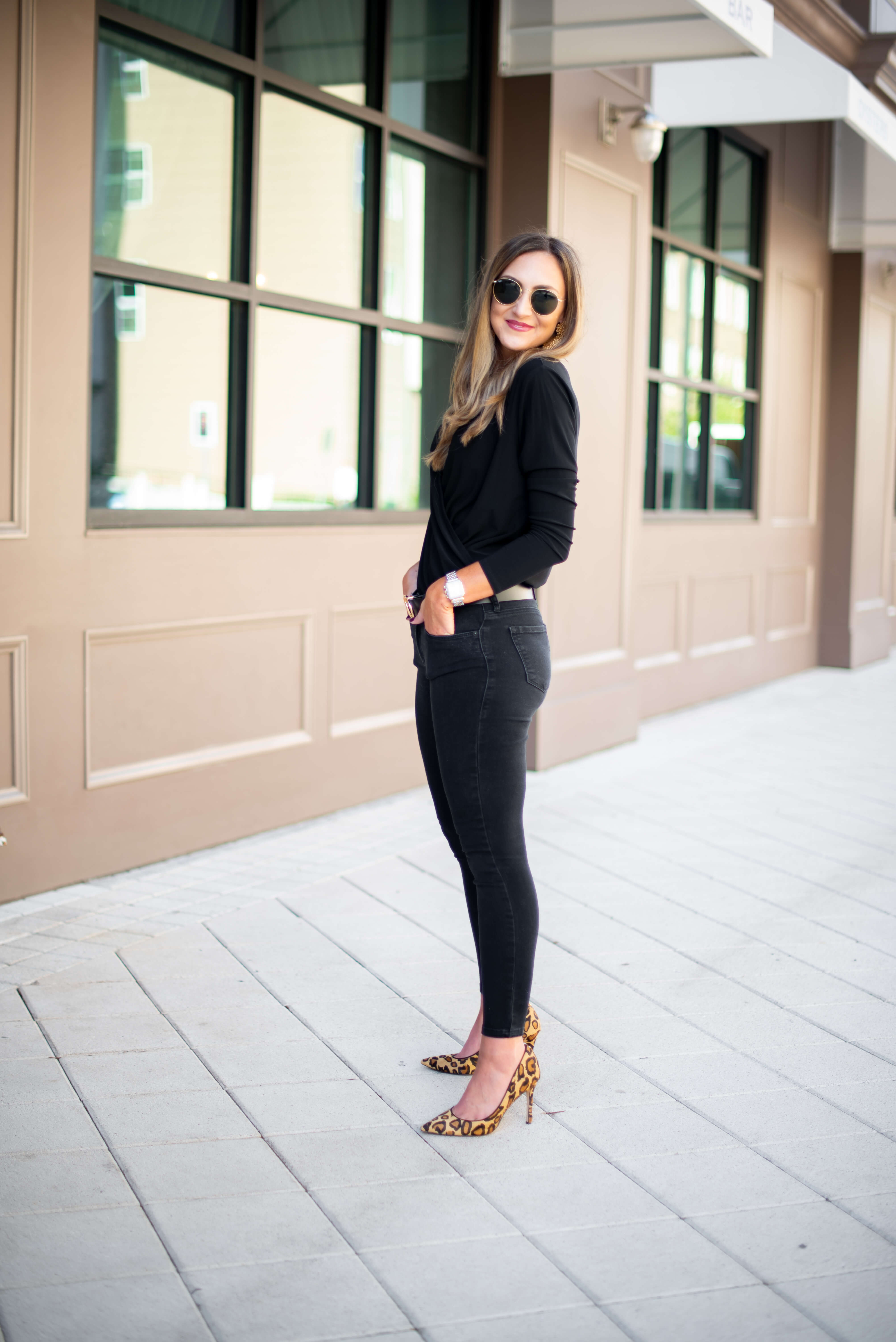 How to Dress Up a Long Sleeve Black Bodysuit | 2 Ways October 17, 2018 | Today I’m partnering with Macy’s during their 25% off Customer Appreciation Sale running through October 21st to show you guys how I dressed up a bodysuit two ways! Truth be told, this is my first bodysuit, as this trend is something that I’ve shied away from in the past. When I found this adorable (under $50) cross front bodysuit from Macy’s my wheels started turning and I decided to take the leap. First off, I cannot get over how easy it was to wear and secondly, it was SO refreshing to step out of my comfort zone a little, which is why I wrote an entire post about it! While it’s fun to post lots of casual outfits, I LOVE trying new trends and this post was super fun to plan and execute. These outfits are two of my favorites that I’ve blogged in recent memory…here are the details! Use code THANKS to get 25% off at Macy’s! How to Wear a Long Sleeve Black Bodysuit Two Ways: Look #1: Fashion Forward Mama got all dressed up! …and she loved it! This outfit made me feel like a million bucks and is so fashion forward and fun to wear. The jeans literally jumped out at me in the store and I happily agreed to take them home. I love the silhouette of them (higher waisted, slight flare hem) and the stud details and tulip hem take them to the next level. To me they look like a designer brand, but you’ll be happy to know that they are under $100! Pairing them with the long sleeve black bodysuit was so easy and gave such a chic look. Bodysuit | Fashion Denim | (Similar) Heels | Belt Bag | Necklace (not online yet, but also INC. brand) | Earrings The icing on the cake of this outfit was this convertible belt bag! It picked up the gunmetal from the denim details perfectly and elevated this outfit even further. It can be worn as a belt bag OR as a cross body, so it’s really versatile. Every single item that I’m wearing in this look is from Macys’ own brand, I.N.C.! I was BLOWN AWAY by their selection and fashion forward pieces. I truly could have bought a closet full for Fall! If you haven’t checked out I.N.C. lately, give it a peek HERE. I loved the entire selection from I.N.C., but the denim selection definitely stood out. Aside from the beauties that I’m wearing, here were some other favorites that I tried on: Look#2: Simple and Chic Bodysuit | Jeans ($45) | Belt | Sunnies | Similar Earrings | Leopard Heels Kept it simple and sleek for look #2 and styled this bodysuit with my favorite (under $50) black stretchy skinnies and fun leopard heels. I topped it off with a super chic black and gold belt and felt confident and pulled together in this outfit, ready for a date night or night out with the girls! Here’s a better look at the long sleeve black bodysuit. So flattering and really doesn’t give off a strong “body suit vibe.” Instead, it looks like you’re just wearing a top and bonus points because it actually stays in place! I wore these same jeans in my last collaborative post with Macy’s (see it HERE) and really do wear them weekly. They are an amazing price + fit and I absolutely encourage you to give them a try! Macy’s carries quite a few styles from this brand and I pulled my favorites— you really cannot beat the price! I hope that you’ll join me in stepping out of your comfort zone a little, whether it’s trying the bodysuit trend or nabbing a pair of fashion forward jeans- it’s always fun and refreshing to try something new! Regardless of what you’re looking for, thankfully Macy’s has you covered and I was so thrilled to partner with them on today’s post. Make sure to use code THANKS between October 17-21st for 25% off of your purchase during the Customer Appreciation Sale! As always, all opinions are my own. Photos by Audrie Dollins. Loving this long sleeve black bodysuit feature? Take a look here for more of my fashion favorites! Thank you Macy’s and ShopStyle for sponsoring this post