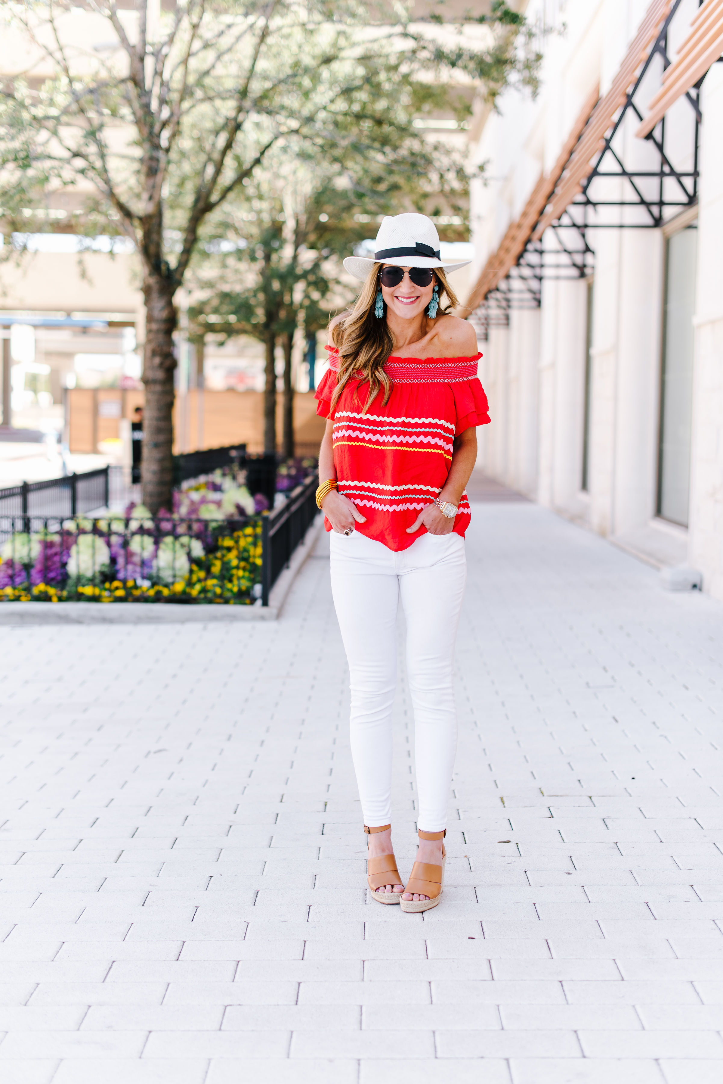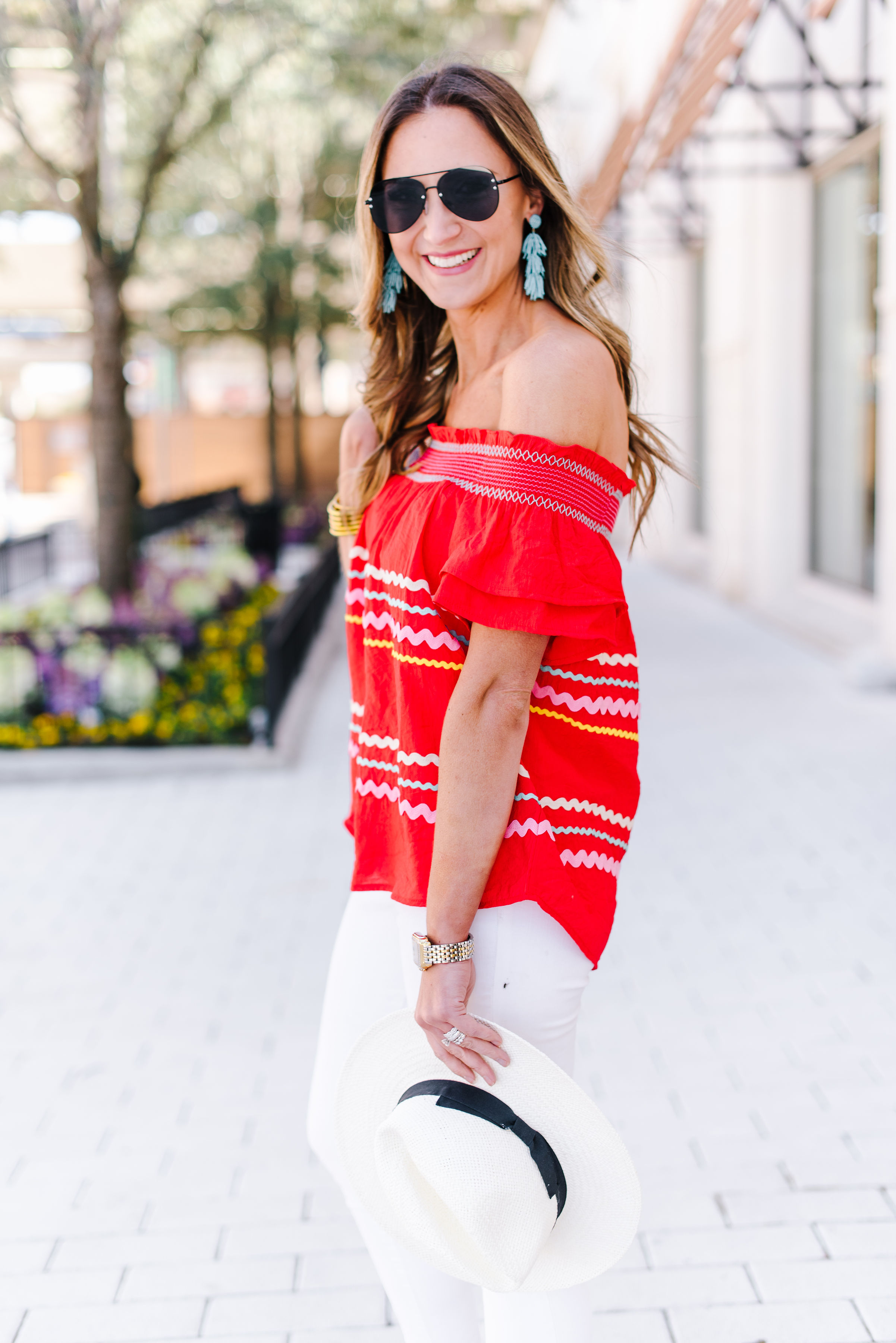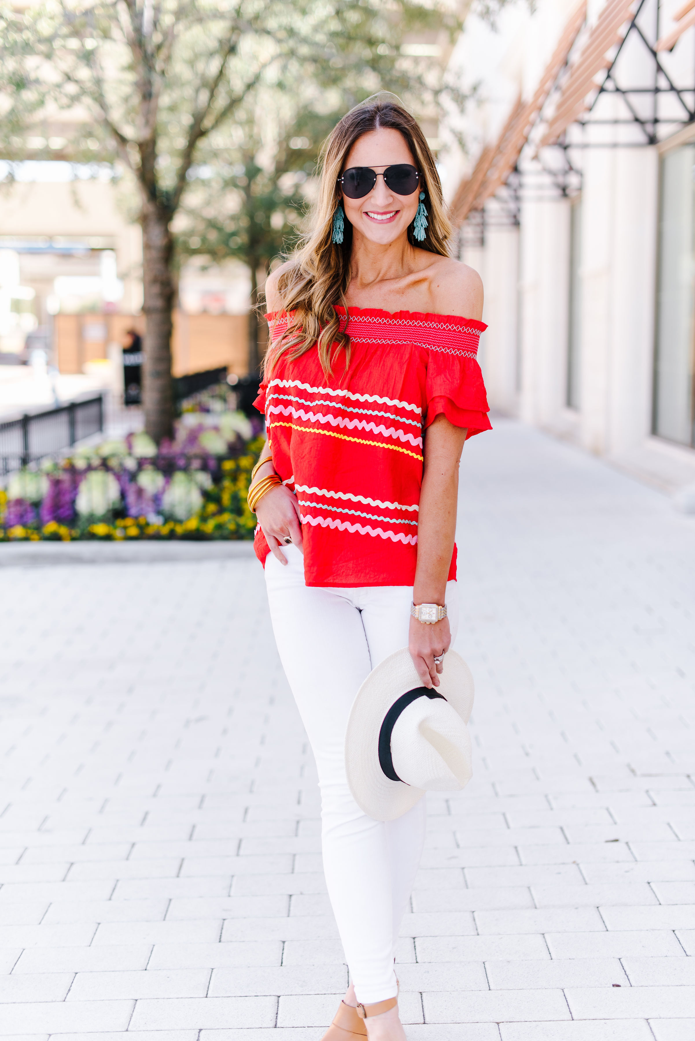 New to the Shop | Ric Rac! February 21, 2019 | Mornin’ friends! First, thank you so much for the positive feedback from yesterday’s beauty post. I tried so hard to make it informative and really stepped out of my box with the Instagram tutorial. I’m glad it was helpful and I really hope to do more beauty soon! Today I’m sharing a new arrival in the Shop because, well, it’s too dang cute NOT to share! It’s $39 of Spring goodness wrapped in colorful, off the shoulder, ric rac clad goodness and it has all of us in the office doing a dang happy dance! Even if you’re not in the Shop (but really what are you waiting on?! We have so much fun!) I wanted to give you a chance to snag this top, so here ya go! It comes in a gorgeous tomato red and deep navy and needs to be in your suitcase for Spring Break! SHOP IT HERE! Ric Rac Top $39 | White Jeans | Panama Hat | Espadrille Wedges | Gold Bangles | Watch | Sunnies The top fits very TTS and I am wearing a Small here. The smocked off the shoulder adds another element of detail and of course the ric rac is the show stopper. We love everything about it. Aside from this must have top, I’ll touch on these white jeans again. I know that most of you have heard me chat about them non-stop for a year now—but if you’re new—listen up! Madewell makes the BEST denim and their white skinnies do not disappoint! This is my second year wearing them (and I wear them nearly year around) and I can confidently say that I’ve never found a pair of white jeans that I like as much as these. I find that they run overall TTS and I wear a 27 in them. The other Spring staple that I’m also wearing here is this espadrille wedge! They are the perfect neutral shoe to go back to nearly EVERY Spring and Summer outfit, but are also SO comfortable! They are priced well under $100 and come in quite a few colors. If you need a go-to wedge, these don’t disappoint! See all of the colors HERE. Here’s the navy version and a view of how well it pairs with shorts as well. Such a fun date night, girls night or just daytime Summer top that will last you the whole season through. It’s also NOT sheer and is easy to wear and so well made. Not to mention THE $39 PRICE! SHOP IT HERE. I’d love to see you guys over in the Shop! Here are two ways to access it and check out our new arrivals as they post! JOIN OUR FACEBOOK GROUP HERE SHOP WITHOUT FACEBOOK HERE