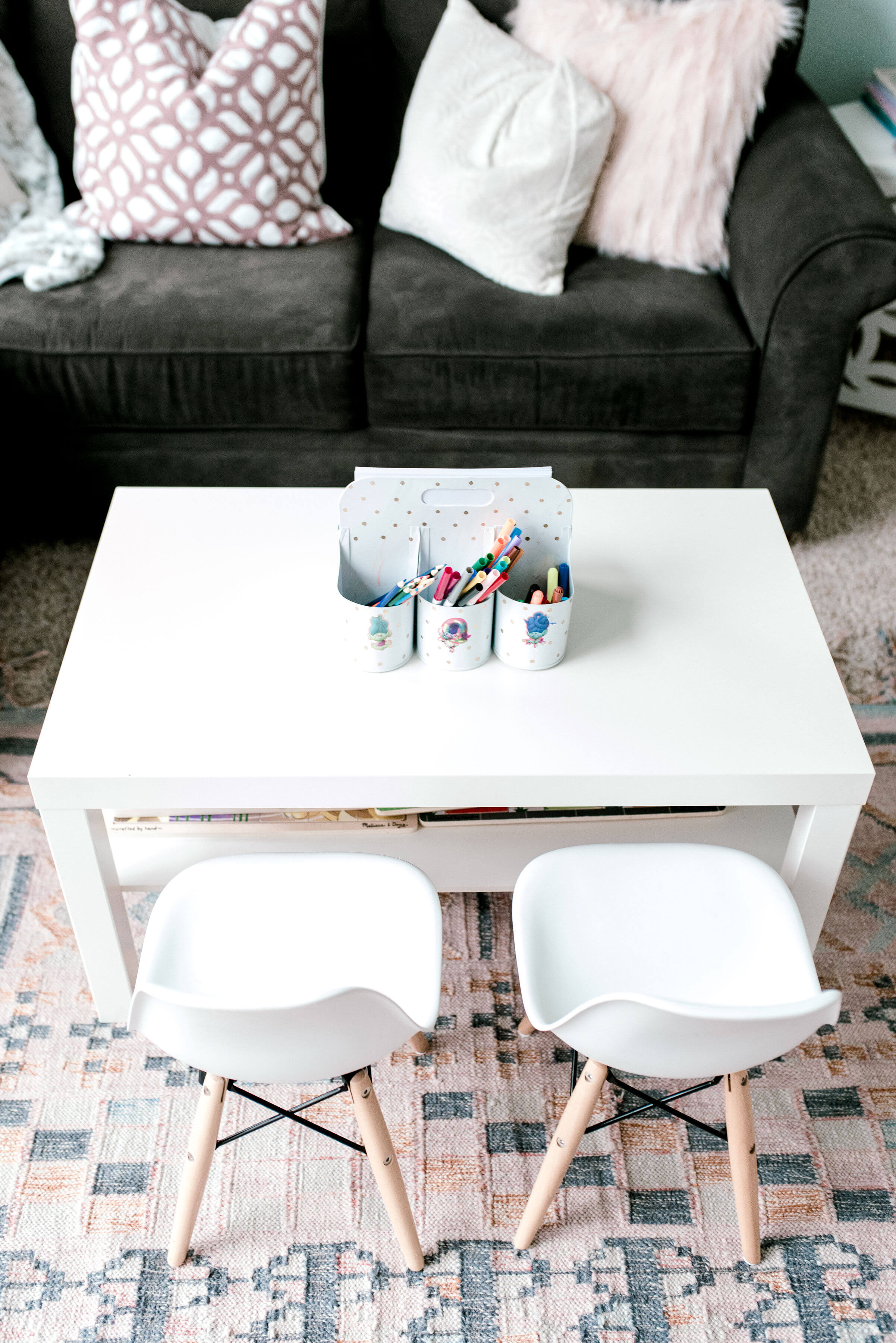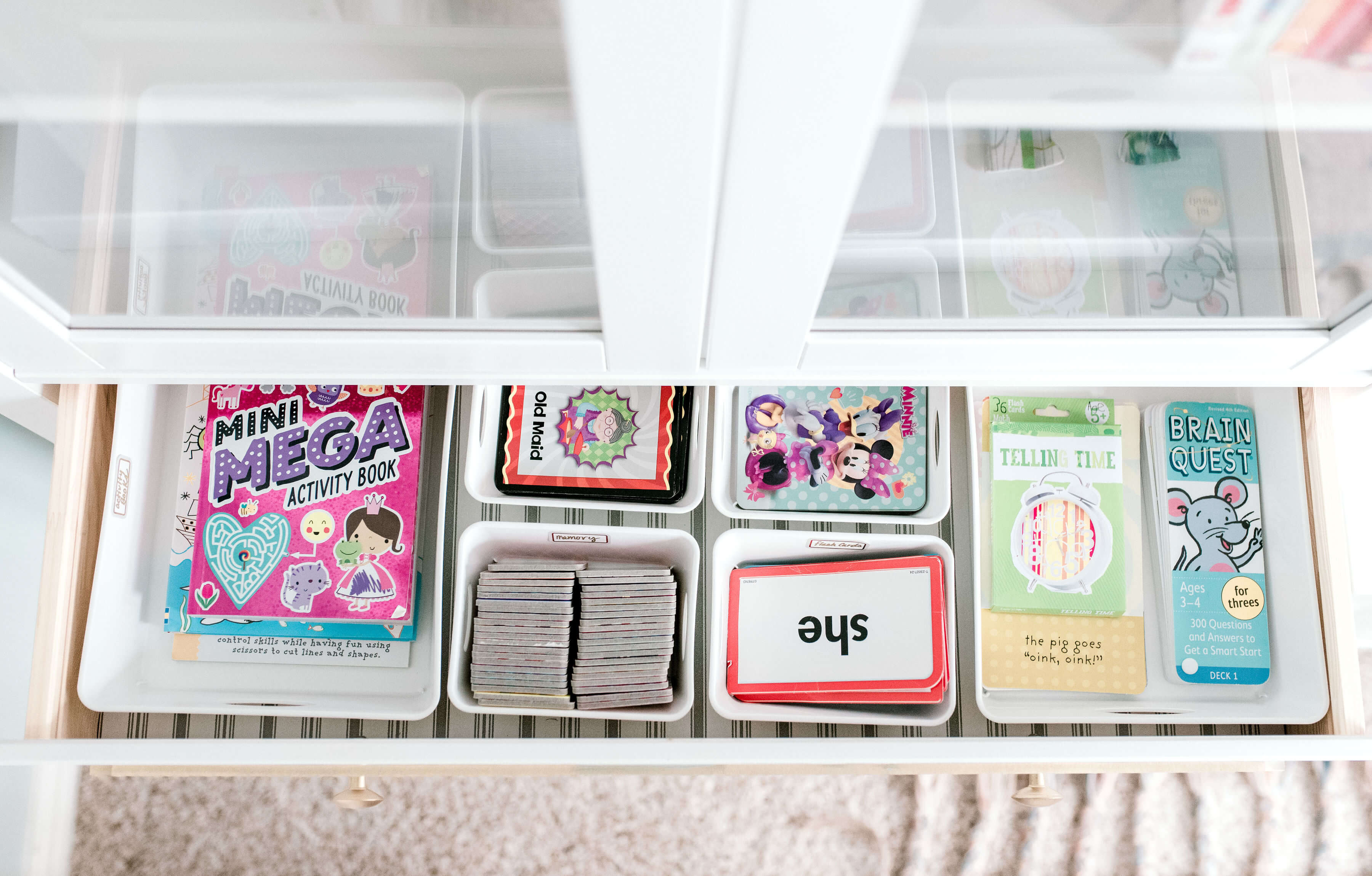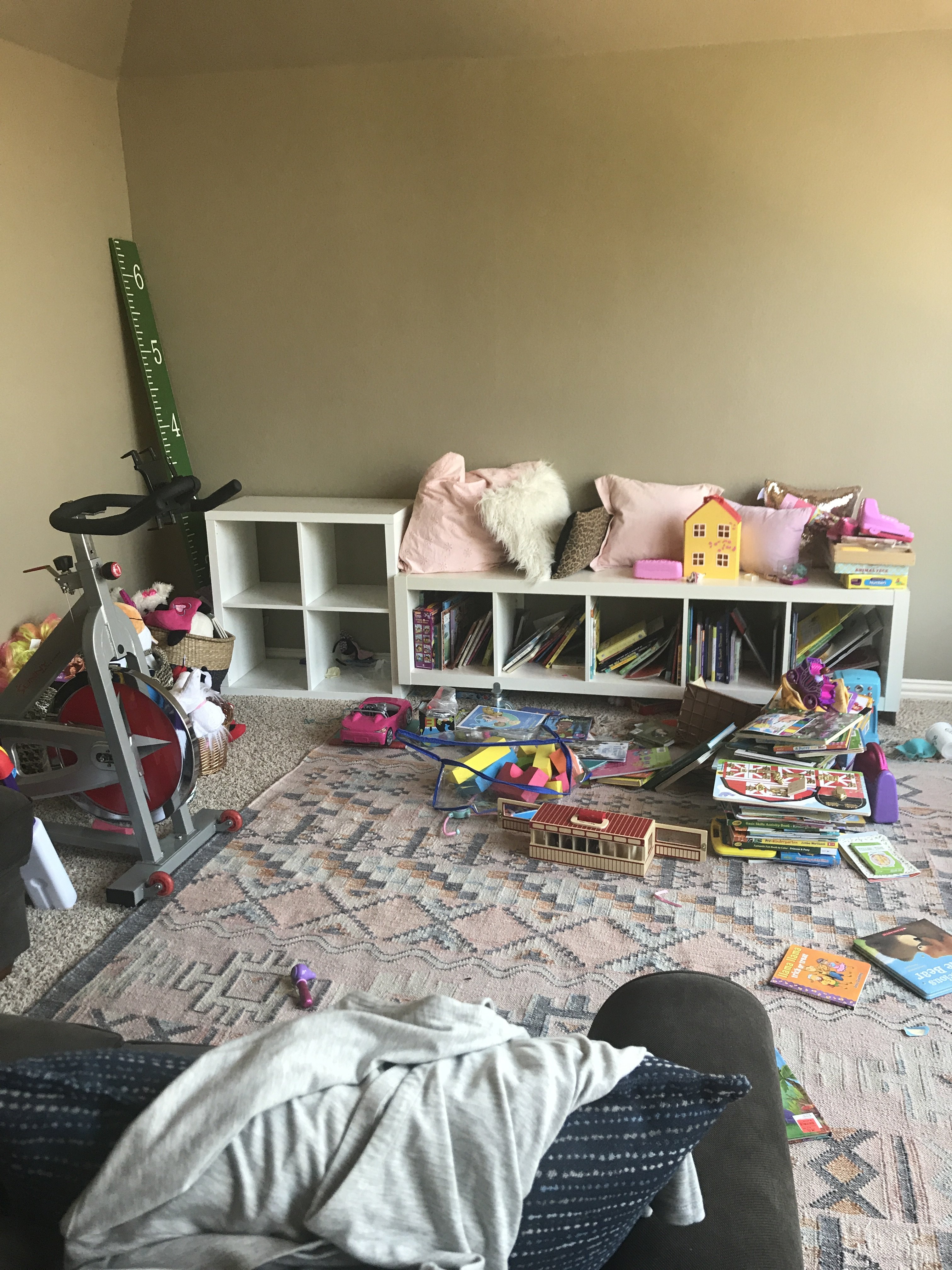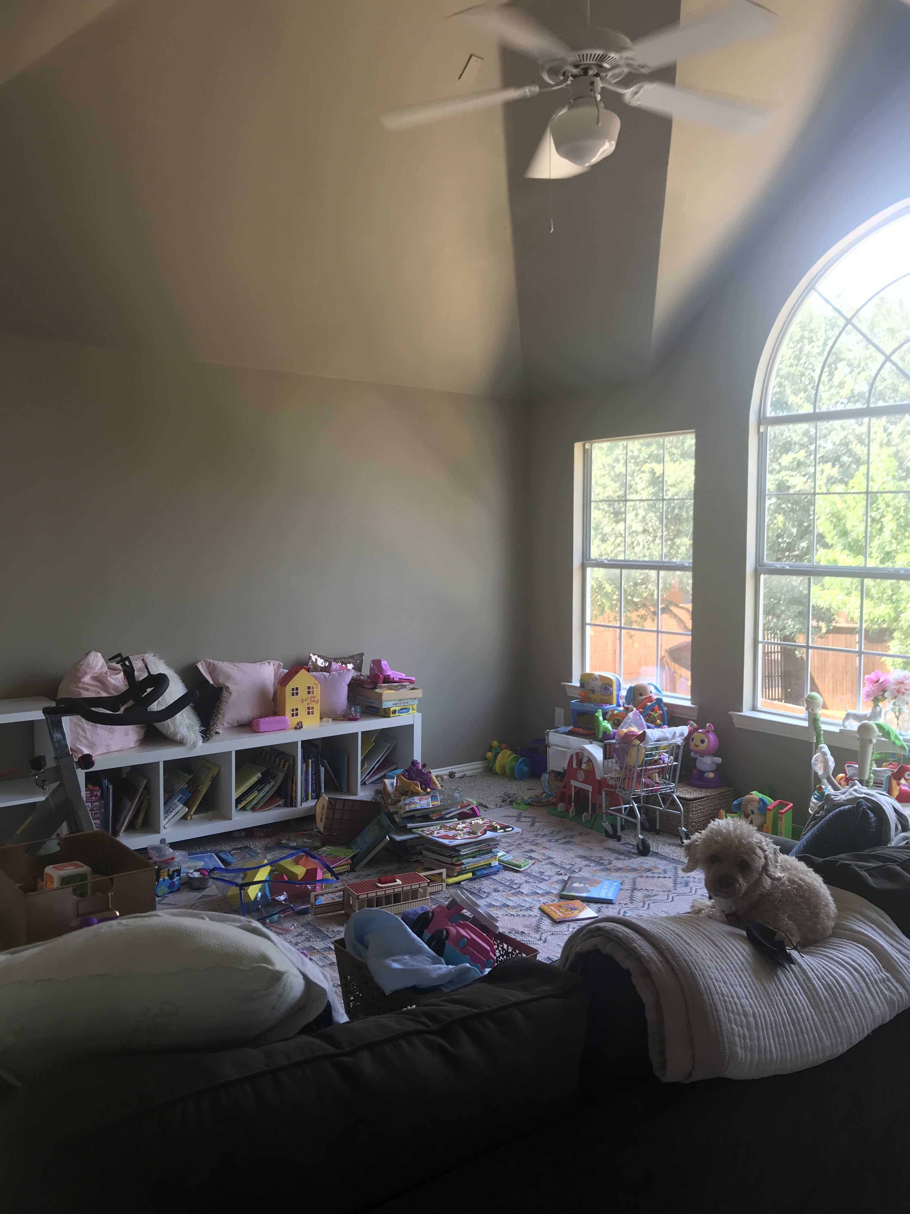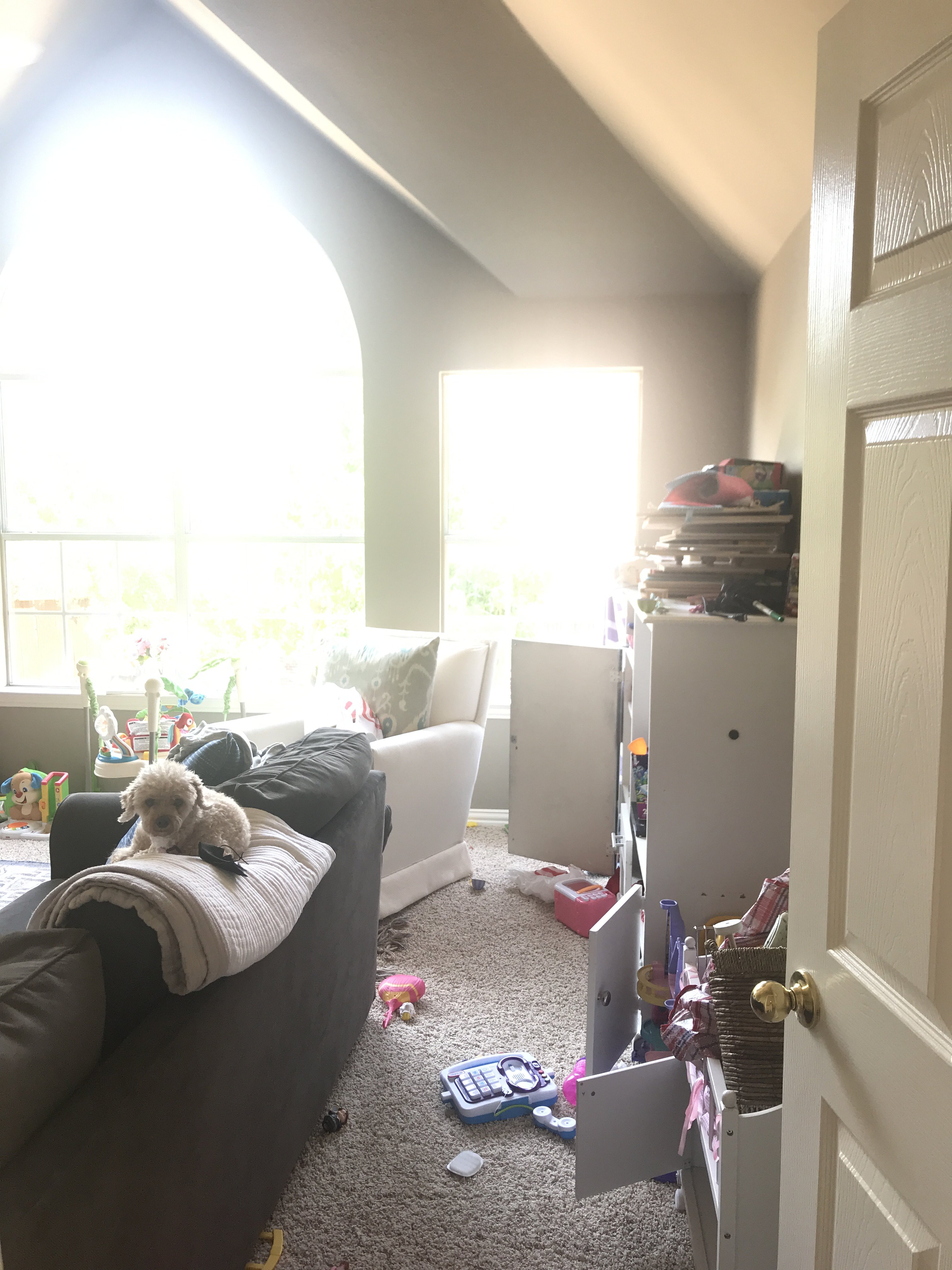 Playroom Reveal | Dallas Home Edition February 12, 2019 | Whohoooo for finally pulling together a room playroom reveal!!!! We’ve been in our home in Dallas for nearly a year and I finally feel like this house has come together piece by piece. Most rooms are 90% done , but honestly the decor has taken a bit of back seat as we try to get settled with school, work, etc. When we were looking at homes, this one stood out because there was a dedicated playroom/media space upstairs. It wasn’t too big and was just cozy enough to make a fantastic playroom + lounging area for the family. As we moved in, it was the first space to take priority to make functional. The girls desperately needed space that they could own, and also one where we could spend time together as a family. We took it step by step and enlisted the help of Katrina over at Operation Organization to help us make thoughtful and purposeful organization decisions. Looking back at how functional the space is day to day for us, I can tell you that it’s made all of the difference, especially in a room like the playroom. In this post I’m sharing all of the decor details (sourced all together at the end of the post), plus some valuable tips, tricks and advice from Katrina on how to thoughtfully work through and organize a space like this. I hope that you enjoy! Style Your Senses | Playroom Reveal! To give you a visual the photo above is the angle entering from the door and is a view of how the room looks as you walk in. We love this room because of all of the natural light that it gets. Its rare that we ever have the overhead light on in here and just love how bright and airy it turned out. After photos are never quite as impactful unless you see the BEFORE images, right?! Even though I am awfully embarrassed of these, I think it’s necessary to show you how the room looked pre-move in and then how much of a dumping ground it became as we got settled. It’s mortifying and I cannot tell you how much MORE use we get out of it now that everything is organized and neat. Below is the image of how it looked pre-move in. Still bright but the dark mocha paint really made it feel less airy. Here’s how it looked upon moving in. It became that room during a move in that was quite literally the dumping ground for anything that didn’t have a home. Exercise bike?? Sure, put it in the playroom. Old sofa? Yep, the playroom. Countless toys, gadgets and oversized plastic contraptions?? Yes, the playroom of course! When we were finally moved in, it became overwhelming to even walk in there and was a less than desirable space for the girls to enjoy themselves. Nothing had a home, we had WAY more junk than we needed any we found ourselves literally shutting the door on the space and avoiding it like the plague. I was so overwhelmed with where to start that I had to call in the professionals on this one and I’m so so glad that I did! Katrina is going to go into details about her tips for organizing a playroom below, but as a part of the process we went through each and every toy together and separated them into DONATE and KEEP piles. We then scrubbed through the KEEP piles multiple more times, really thinking through if they used the toys or not. Overall we donated 6 huge bags of toys that the girls had either outgrown or simply didn’t play with. We got rid of any puzzles or toys that were missing pieces, anything that wasn’t age appropriate and any books that we didn’t enjoy. The process was very hard at first because I found that I really do have any emotional attachment to anything concerning the girls, but in the end it was so freeing and I love that their playroom is now so well curated. What I’ve learned is that less toys actually fosters better play. Who knew?! Style Your Senses Playroom | The Design Process I knew that I wanted to use the far left wall to it’s fullest potential and that’s where I wanted to anchor the room with the TV and TONS of storage. Here’s the initial mockup of my vision and I’ll detail out how I pulled it together below. Here’s the finished product! Nearly every square inch of the wall has become usable space either for storage, entertainment or to add some light. It’s one of my absolute favorite scenes in our house at the moment. The good news is that it makes a huge impact but didn’t cost a total fortune and can probably translate into working for quite a few of your walls. I started with the TV and built out from there. I already had the rolling bookcase (remember it from our Charlotte Playroom??) and it was perfect for under the TV. Each cubby has a functional and labeled basked (babies, stuffed animals, legos, books x2), so that it really helps with storage, but everything is neatly disguised. On top we displayed the books that we read most often and then I’ll periodically switch some in and out. From there I found the flanking cabinets from IKEA. I knew that the measurements were nearly perfect to fill out that wall and loved that they had drawer + cabinet storage along with the height to really anchor the wall. I also knew that I was going to immediately jazz them up with o’verlays! O’verlays are one of my absolute favorite brands. They create mouldings and panels that easily adhere to and totally transform furniture! They also have specific kits just for IKEA furniture and let me tell you, they make IKEA look like a million bucks! Remember THIS DRESSER? That’s when I fell in love with o’verlays. For both projects I painted the panels in the same gold spray paint and simply adhered them with nail glue. Here are the ones that I chose for these cabinets. To fill in the extra space I flanked the TV with beautiful and inexpensive sconces. They give beautiful light at night and I love how they add some depth to the wall. When finishing it out, I had a vision of moulding around them. I searched and searched and searched for what I was looking for and kept coming up empty handed. On