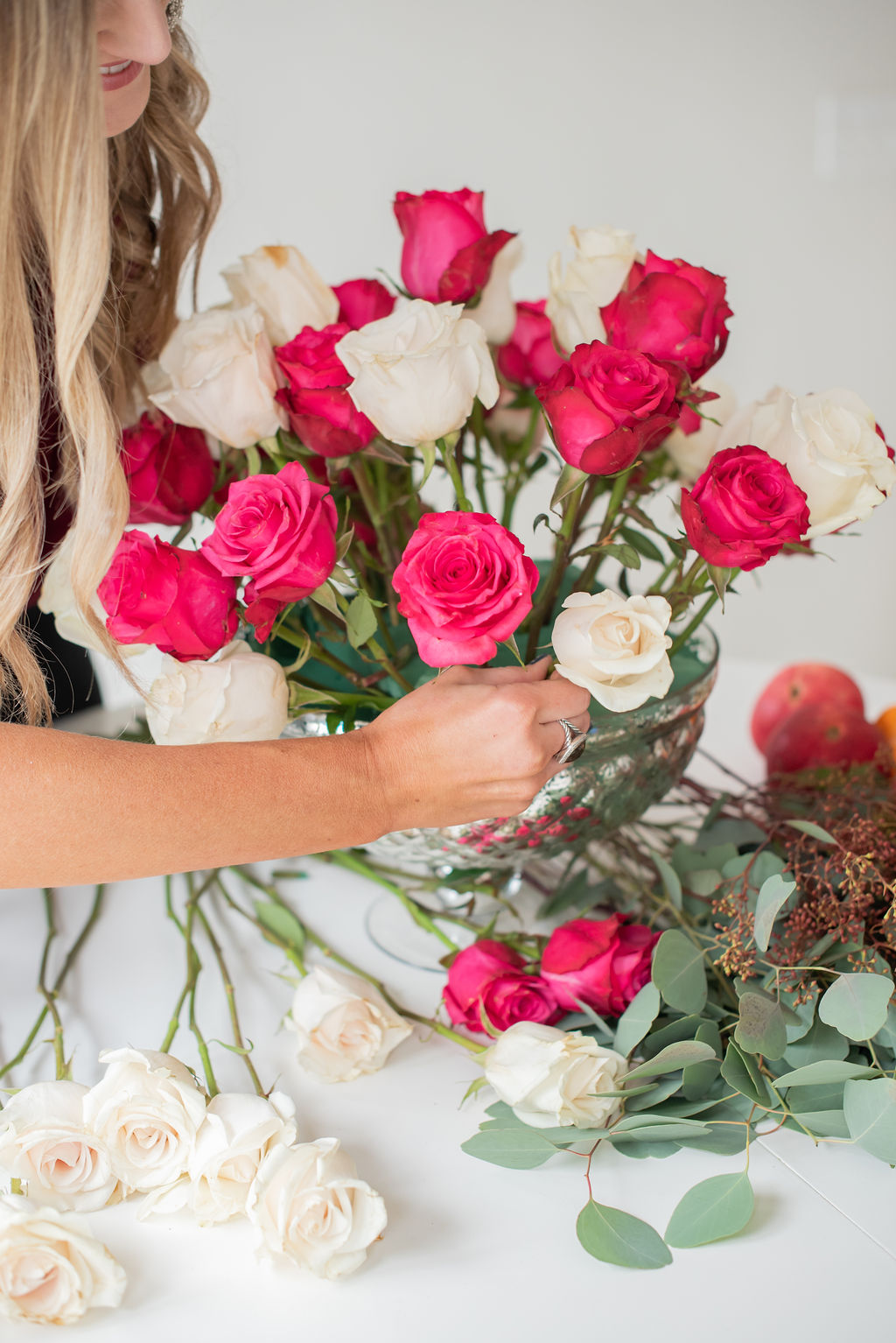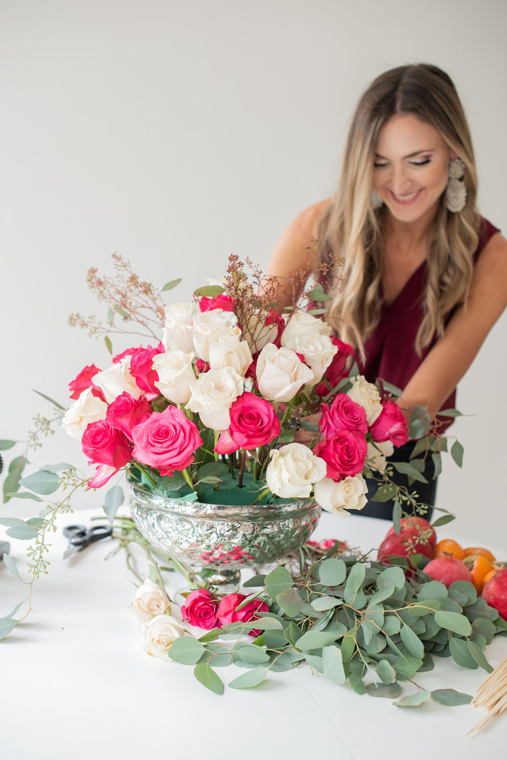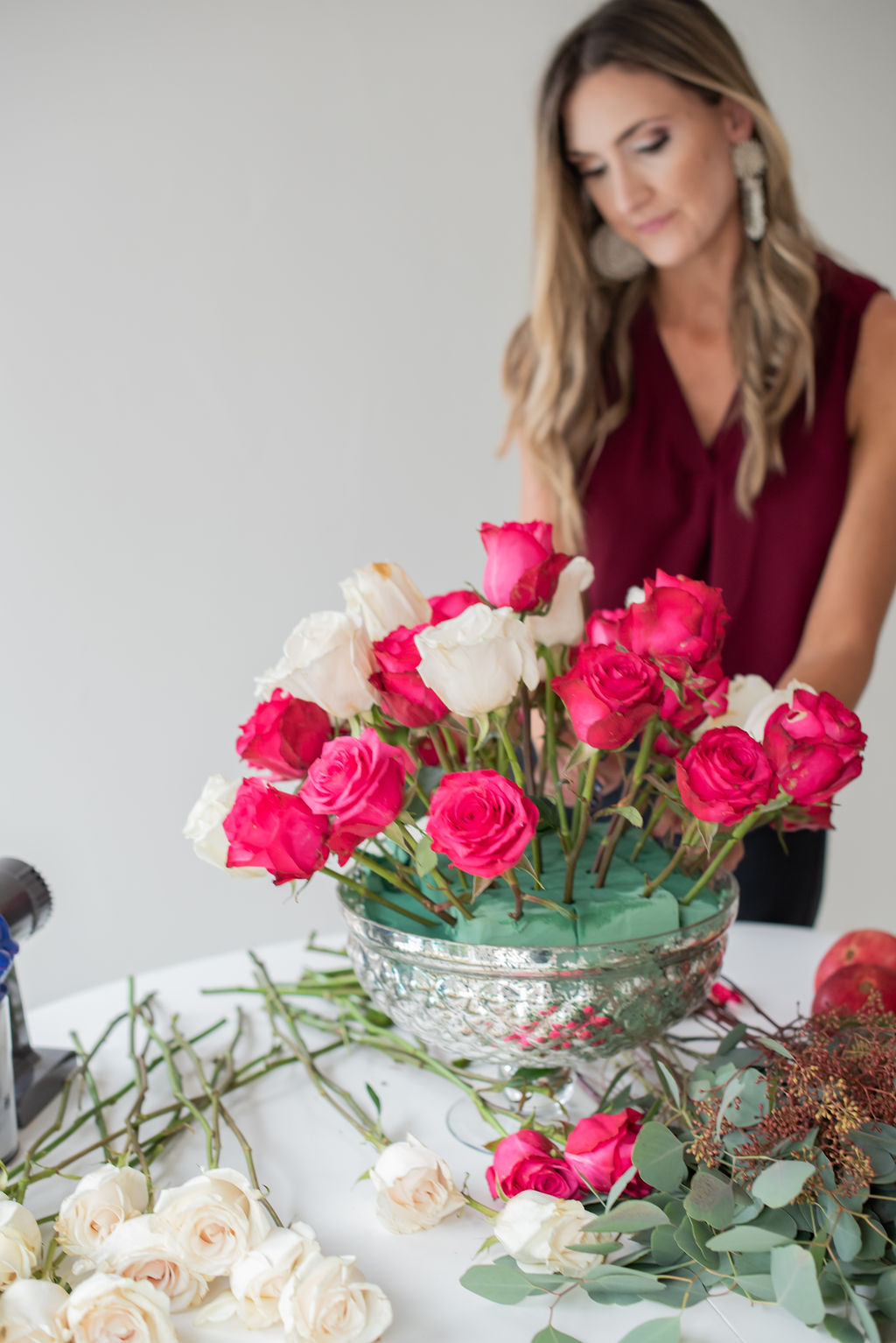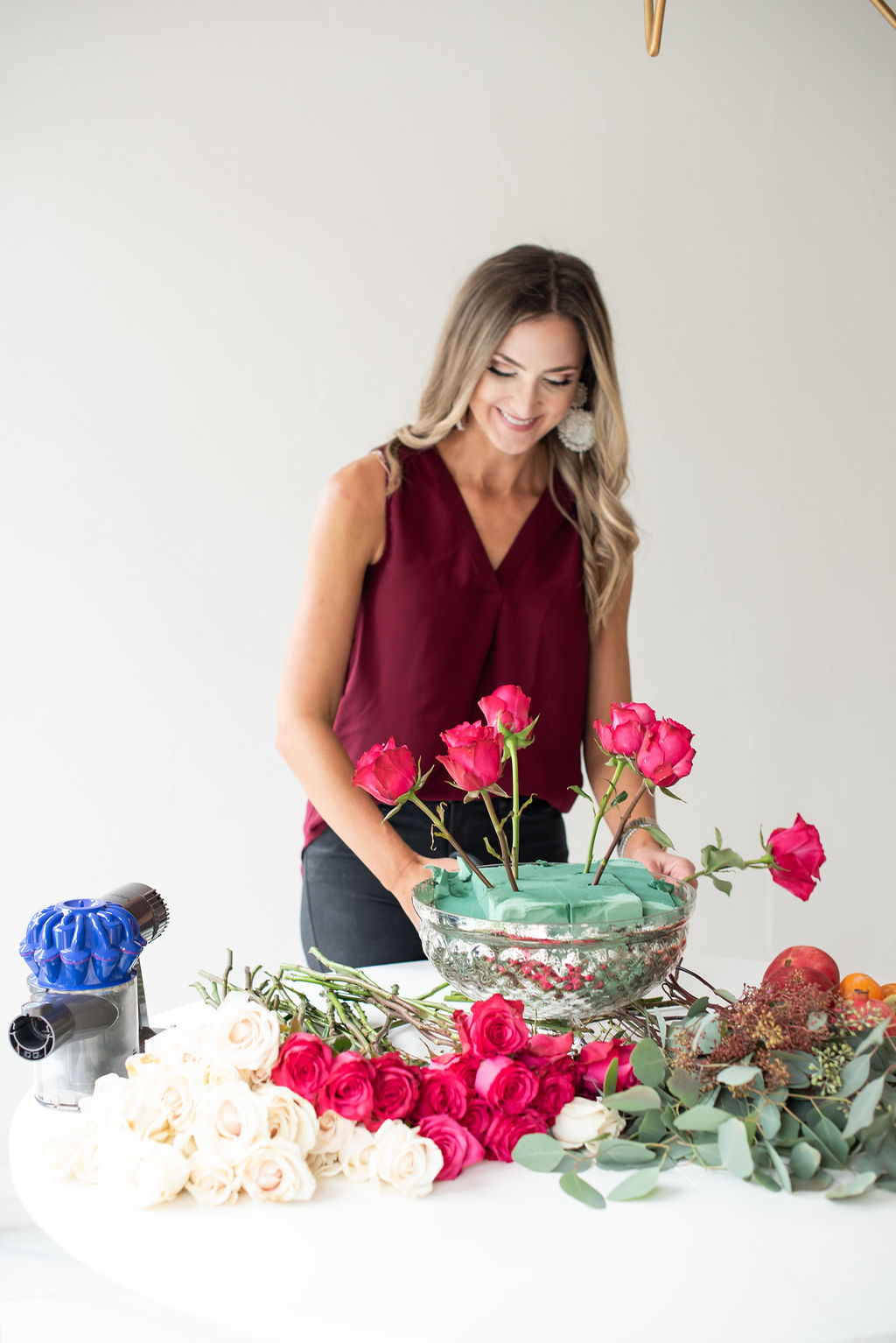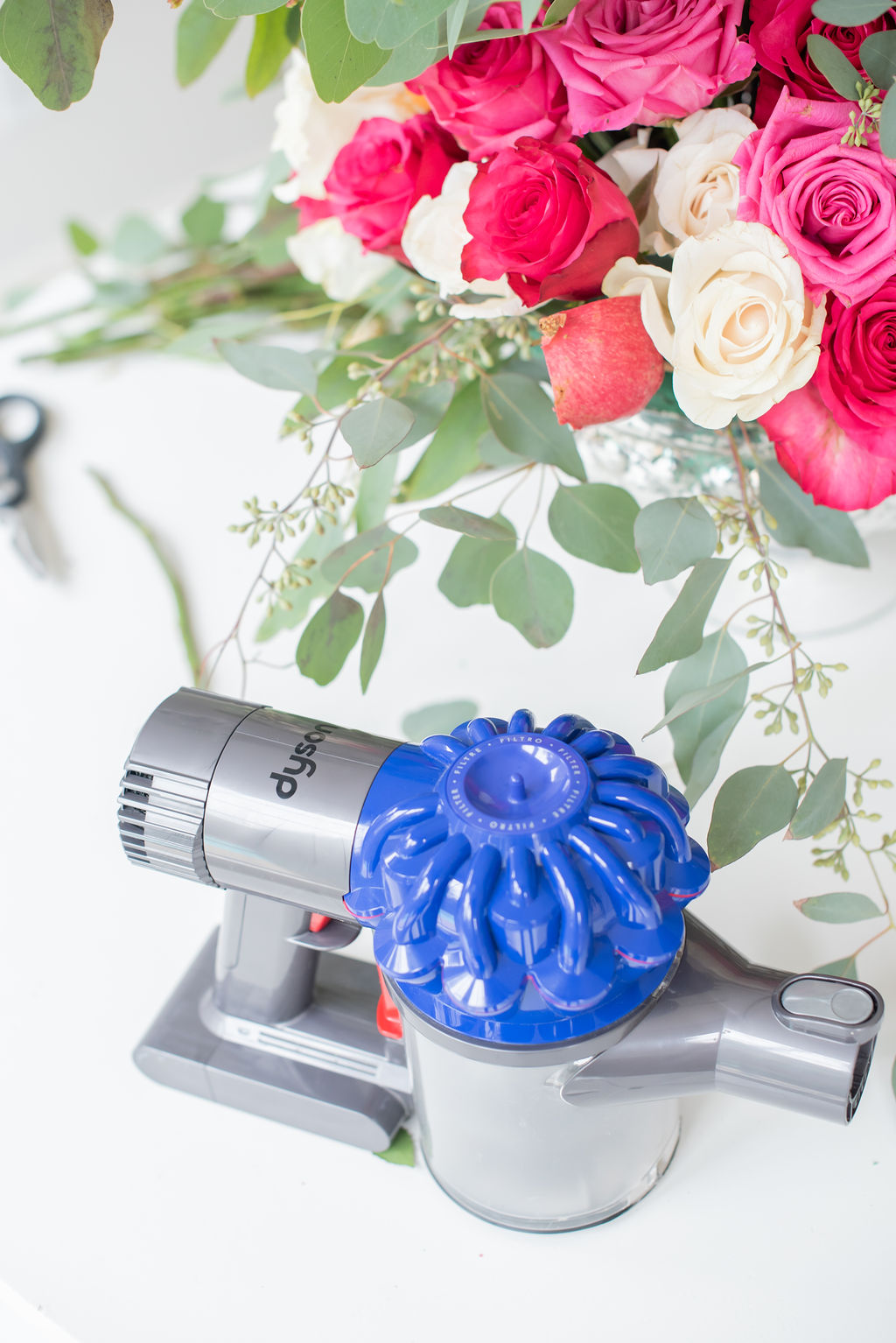 Thanksgiving Tablescape with eBay November 15, 2018 | Today I’m teaming up with eBay to share a peek at our Thanksgiving tablescape and as well as my favorite DIY floral centerpiece that’s very easy to replicate for your own table! When I started to imagine Thanksgiving in our new house I kept coming back to the ginger jar blue that’s already in our dining room and continued to think about pairing it with shades of pink and gold for an out of the box Thanksgiving scheme that felt glam and unexpected. I absolutely love the way it came out and cannot wait to have family and friends in our house this Holiday season! See below for a step by step tutorial on how to make this beautiful centerpiece on a budget and how easy Dyson makes the clean up! I go into crazy lady cleaning mode when I know guests are coming over. I’m like a manic whizzing all over the house and can get cleaning done in record time. I always joke that it’s good to invite guests over once every week or two because that’s the only way that my house gets cleaned. Thankfully, Dyson makes that whole process easier and this year marks the third year that I’ve had mine. Dan actually got me THIS ONE for Christmas one year and I can still say that it’s one of the best gifts that I’ve ever been given. Did you guys know that there are Dyson vacuums on eBay for a total steal??? See HERE for prices you won’t believe! p.s. There’s a HUGE Dyson Event happening on eBay right now…everything is one sale HERE! Turn on your JavaScript to view content One of my absolute favorite things to do is scheme up and set a table! Once I had my color scheme in mind, I began to think through what I wanted the centerpiece to look like. The room is very large with high ceilings, so I knew that I needed to to be a bold focal point, but I also knew that I wanted to make sure guests could still see each other and hold a conversation over the table. I found a beautiful mercury glass bowl (similar to this one) and decided to DIY it. I purchased all of the flowers from my local grocery store and the entire thing cost less than $75. It’s one of my favorite DIY projects of all time and I’m thrilled to share it with you today. Turn on your JavaScript to view content Thanksgiving Tablescape Centerpiece: How To Video (press play) What You Need: Glass bowl or large container of your choice Wet Floral Foam Roses (I used 5 doz) / Remove Leaves Filler (I used eucalyptus and berries) Fresh Fruit (I used pomegranates and persimmons) Kabob Skewers Floral Sheers Step 1: Place the foam in the dish, leaving very little wiggle room. I had to cut and manipulate mine to ensure there wasn’t any extra room Step 2: Start positioning roses around the container making a crescent shape. I do one color at a time to ensure that they are evenly distributed throughout. *Pro-tip: With slightly damp fingers, spread out the petals on your roses so that they appear more full and fancy 😉 Step 3: Continue placing the roses throughout so that you continue to form a dome shape. This is somewhat trial and error, don’t be afraid to adjust if it’s not looking right or trim with your sheers so get the correct shape. Step 4: Where you have large holes, start strategically placing your filler. Instead of having filler all over, I like to have it strategically placed, especially around the bottom and on the sides so that your arrangement looks full, but doesn’t distract from the roses. Step 5: Skewer your fruit. I chose persimmons and pomegranates because they feel Fall and festive and also offer beautiful pops of color. *Pro-tip: Skewers are found next to the kitchen gadgets at your local store. Step 6: Begin placing your fruit skewers throughout your arrangement, focusing on larger holes within the flowers where your floral foam might still show. My method is placing some really deep within the arrangement and some further outward, creating dimension and interest. Step 7: Fill the bottom with water and do a happy dance because you’re done! Step 8: Remove the brush stick from your Dyson and use it handheld for an easy and quick clean up! That’s another thing that I love about my Dyson– how it becomes a handheld vacuum in one snap. I use the handheld portion to clean up small messes, clean out my car, and tackle things like the stairs! If you don’t have a Dyson, add it to your Christmas list ASAP— it may seem silly but in the end it will make your life SO much easier! eBay has an amazing Home + Garden assortment and they can totally help you to recreate our Thanksgiving Tablescape on a budget. Here are a few options: Similar Mercury Glass Bowl (perfect for arrangements) Similar Dinnerware Set Similar Gold Tray Similar Beaded Placemats Similar Gold Chargers Similar Chairs Similar Gold Flatware Tons of Ginger Jars HERE Check out eBay’s Home and Garden Assortment HERE for more Home Decor Inspiration! Thank you to eBay for sponsoring this content! I hope that you’ll join us for more Holiday fun around here over the next few weeks.